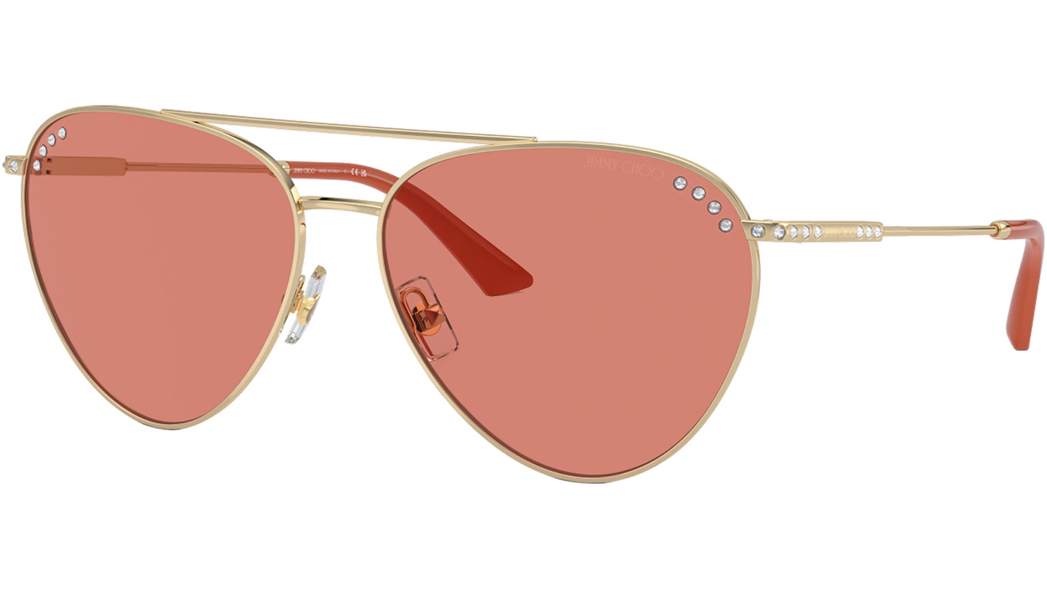 Occhiali da sole Jimmy Choo JC4002B 300684 donna, con montatura aviatore in acciaio color oro chiaro e lenti rosa in bio poliammide. Naselli regolabili. Linea: Crystal. Codice modello: JC4002B. Codice colore: 300684. Rivenditore autorizzato Swarovski Eyewear online. Ogni prodotto Swarovski viene consegnato con astuccio originale e accessori ed è coperto da garanzia del produttore di 12 mesi.