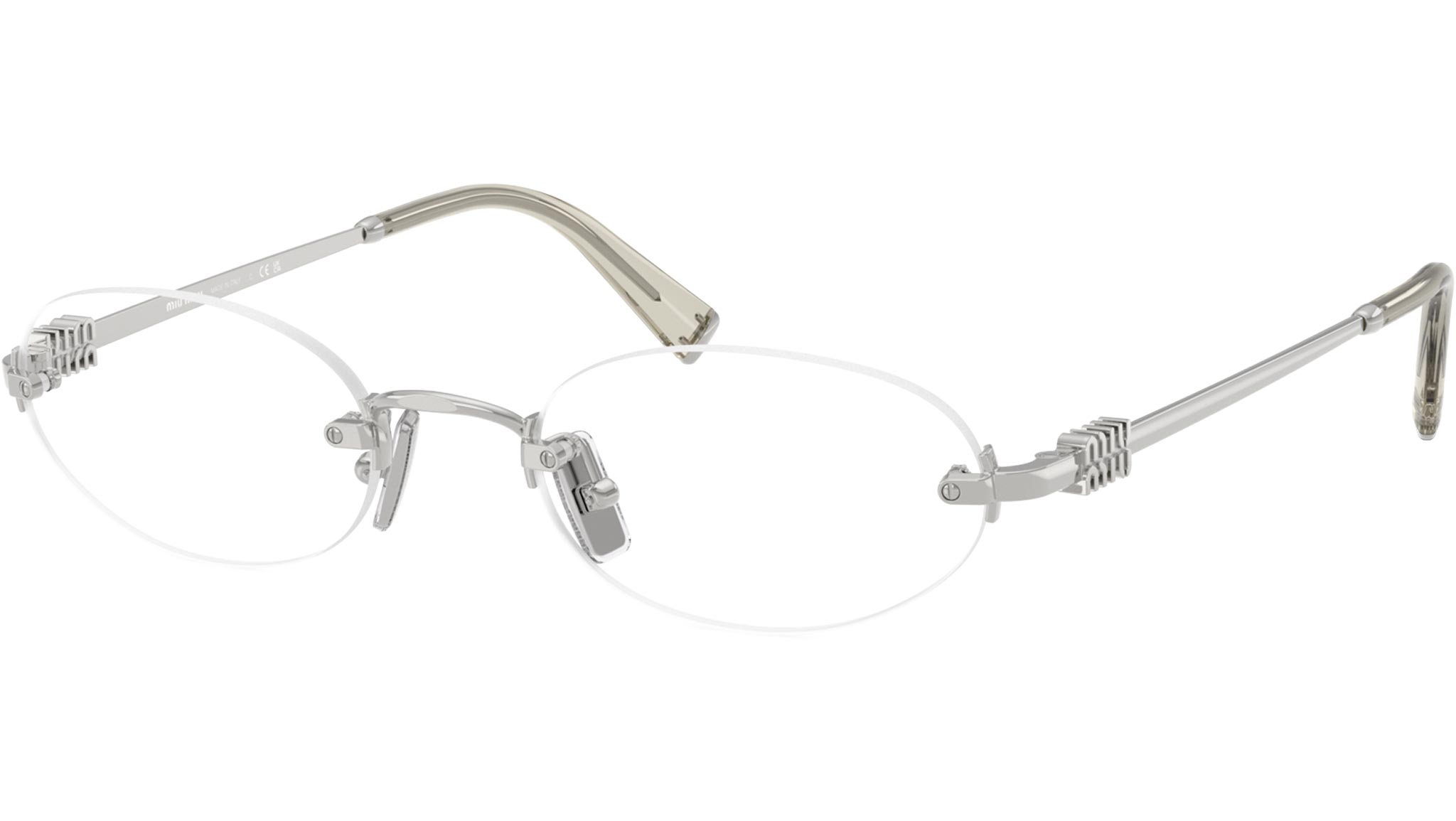 Occhiali da vista Miu Miu MU 53WV 1BC1O1 donna con montatura ovale in metallo argento e lenti demo. Naselli regolabili. Linea: Miu Regard. Codice modello: 0MU 53WV. Codice colore: 1BC1O1. Made in Italy. Rivenditore autorizzato Miu Miu online. Gli occhiali vengono consegnati con custodia e accessori originali e sono coperti dalla garanzia ufficiale di 12 mesi del produttore.