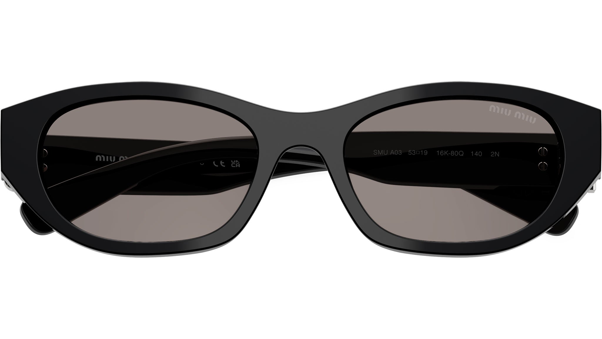 Occhiali da sole Miu Miu MU A03S 16K80Q donna con montatura geometrica in acetato nero e lenti in bio poliammide color grigio scuro. Vestibilità a ponte alto. Linea: Main Collection. Codice modello: 0MU A03S. Codice colore: 16K80Q. Made in Italy. Rivenditore autorizzato Miu Miu online. Gli occhiali vengono consegnati con custodia e accessori originali e sono coperti dalla garanzia ufficiale di 12 mesi del produttore.