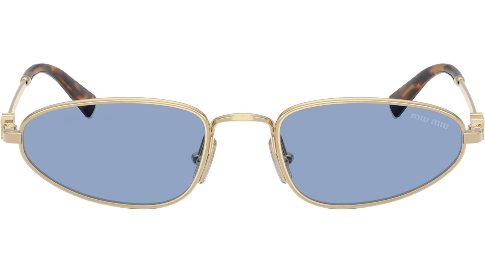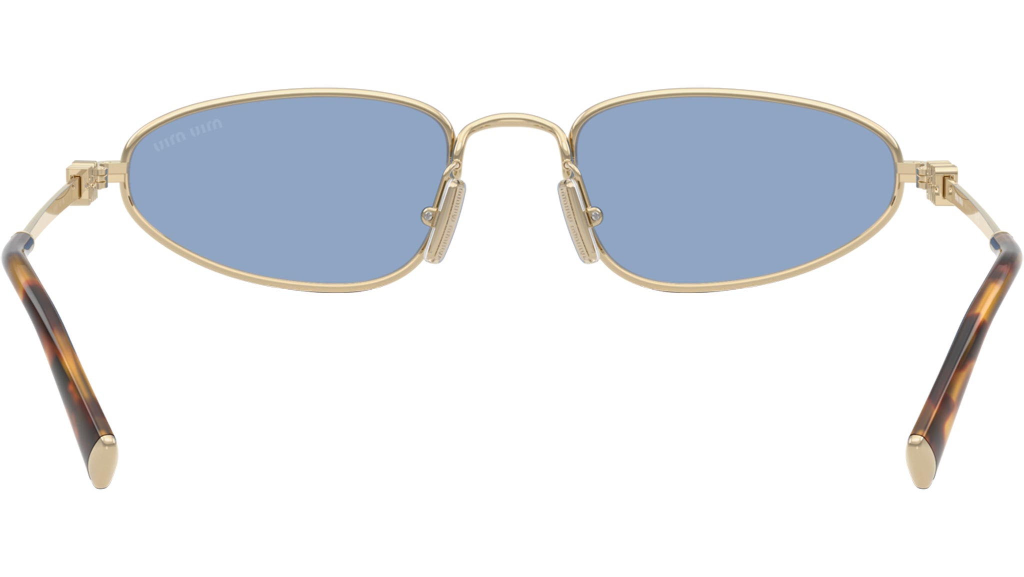 Occhiali da sole Miu Miu MU A52S ZVN60O donna con montatura geometrica in metallo oro pallido e lenti in bio poliammide color azzurro. Naselli regolabili. Linea: Miu Regard. Codice modello: 0MU A52S. Codice colore: ZVN60O. Made in Italy. Rivenditore autorizzato Miu Miu online. Gli occhiali vengono consegnati con custodia e accessori originali e sono coperti dalla garanzia ufficiale di 12 mesi del produttore.