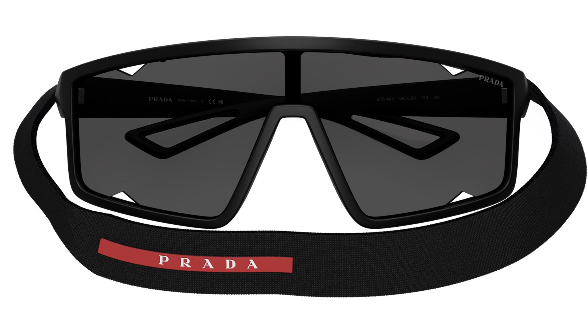 Occhiali da sole Prada Linea Rossa PS A03S 1BO5S0 uomo con montatura rettangolare in iniettato nero opaco e lenti in poliammide color grigio scuro. Vestibilità a ponte alto. Linea: Active. Codice modello: PSA03S. Codice colore: 1BO5S0. Made in Italy. Rivenditore autorizzato Prada Sport online. Gli occhiali vengono consegnati con custodia e accessori originali e sono coperti dalla garanzia ufficiale di 12 mesi del produttore.