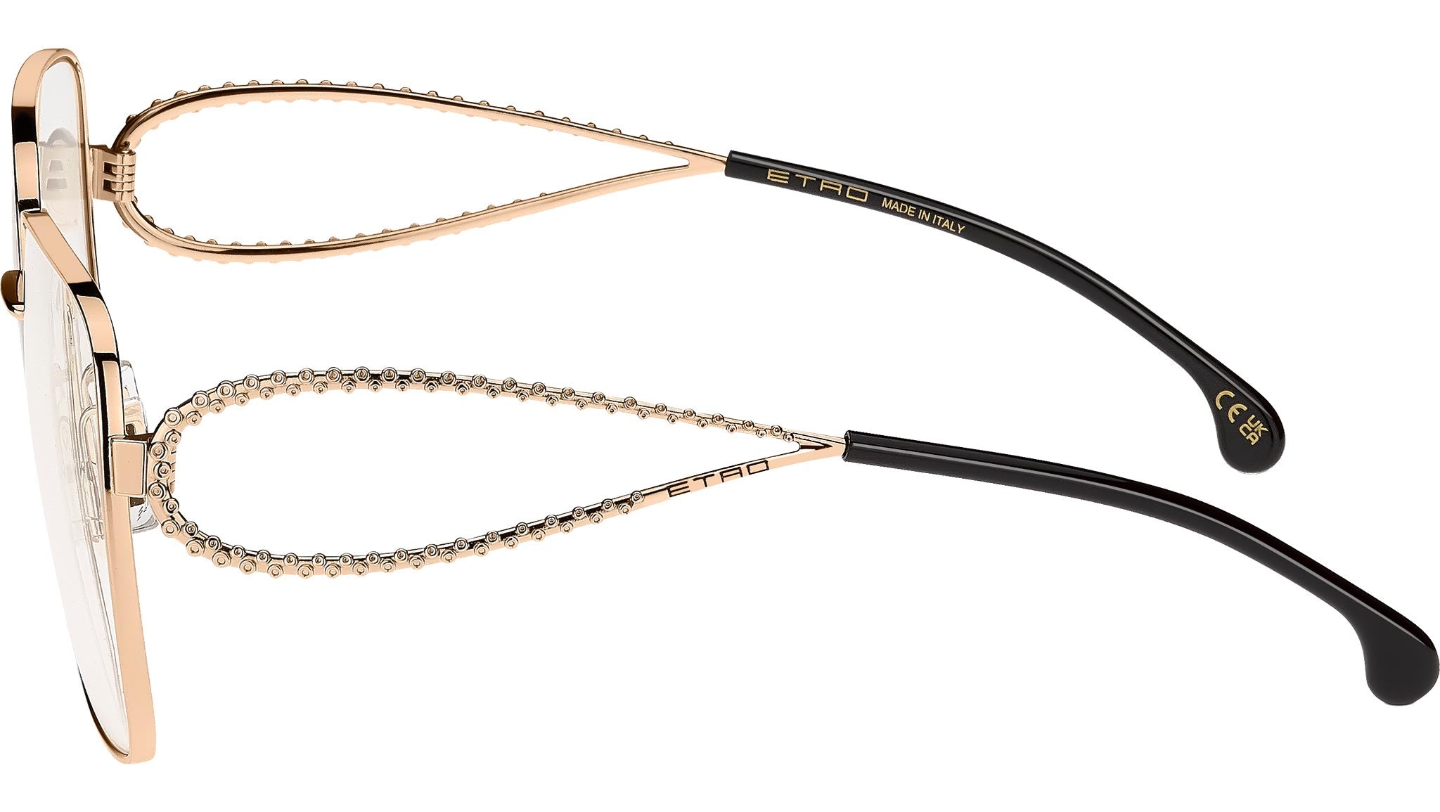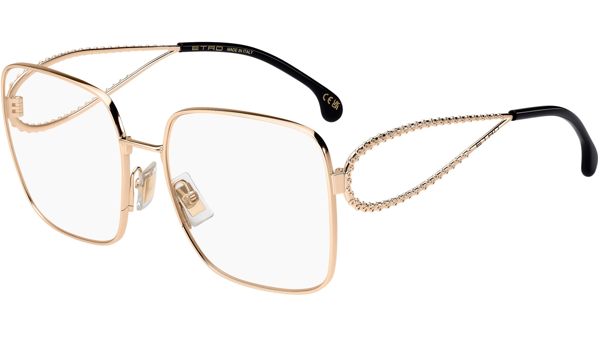 Occhiali da vista Etro 0073 000 donna con montatura squadrata in metallo oro rosa e lenti demo. Un omaggio alla libertà creativa e all'arte, gli occhiali da vista 'Etropaisley' di ETRO traggono ispirazione dalla collezione di gioielli del brand. La silhouette in metallo è arricchita da aste scultoree, lavorate con una tecnica innovativa di incisione 3D che richiama il celebre motivo Paisley, garantendo al contempo leggerezza e comfort quotidiano. I terminali in acetato e i dettagli floreali, insieme al logo ETRO, completano questo design eccezionale, disponibile in una selezione di colori eleganti. Linea: Etromania. Codice modello: 109302. Codice colore: 000. Rivenditore autorizzato Etro online. Gli occhiali vengono consegnati con custodia e accessori originali e sono coperti dalla garanzia ufficiale di 12 mesi del produttore.