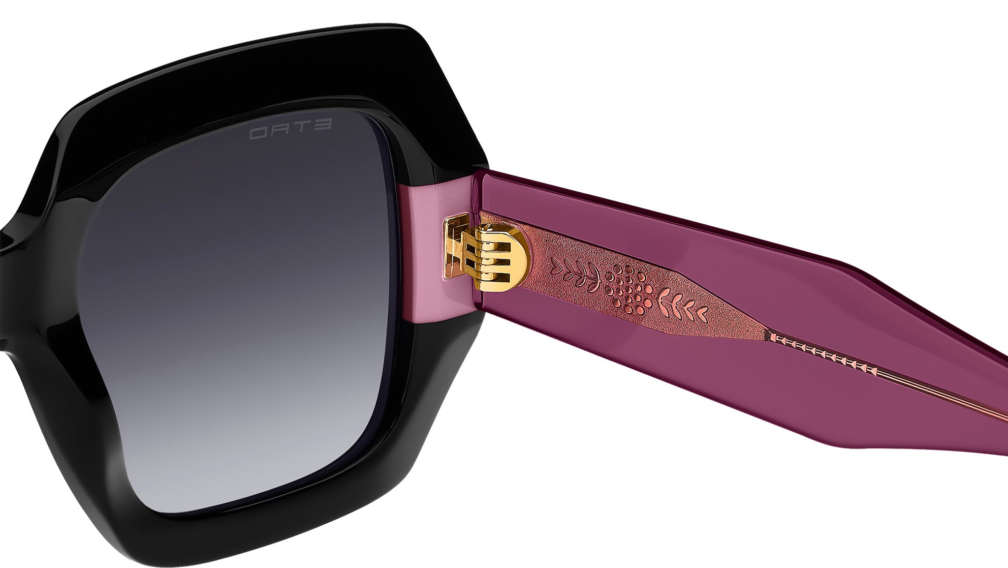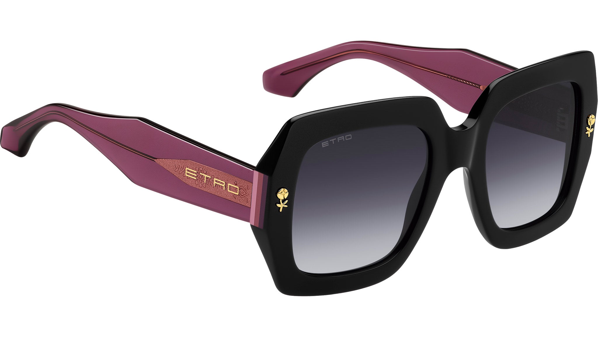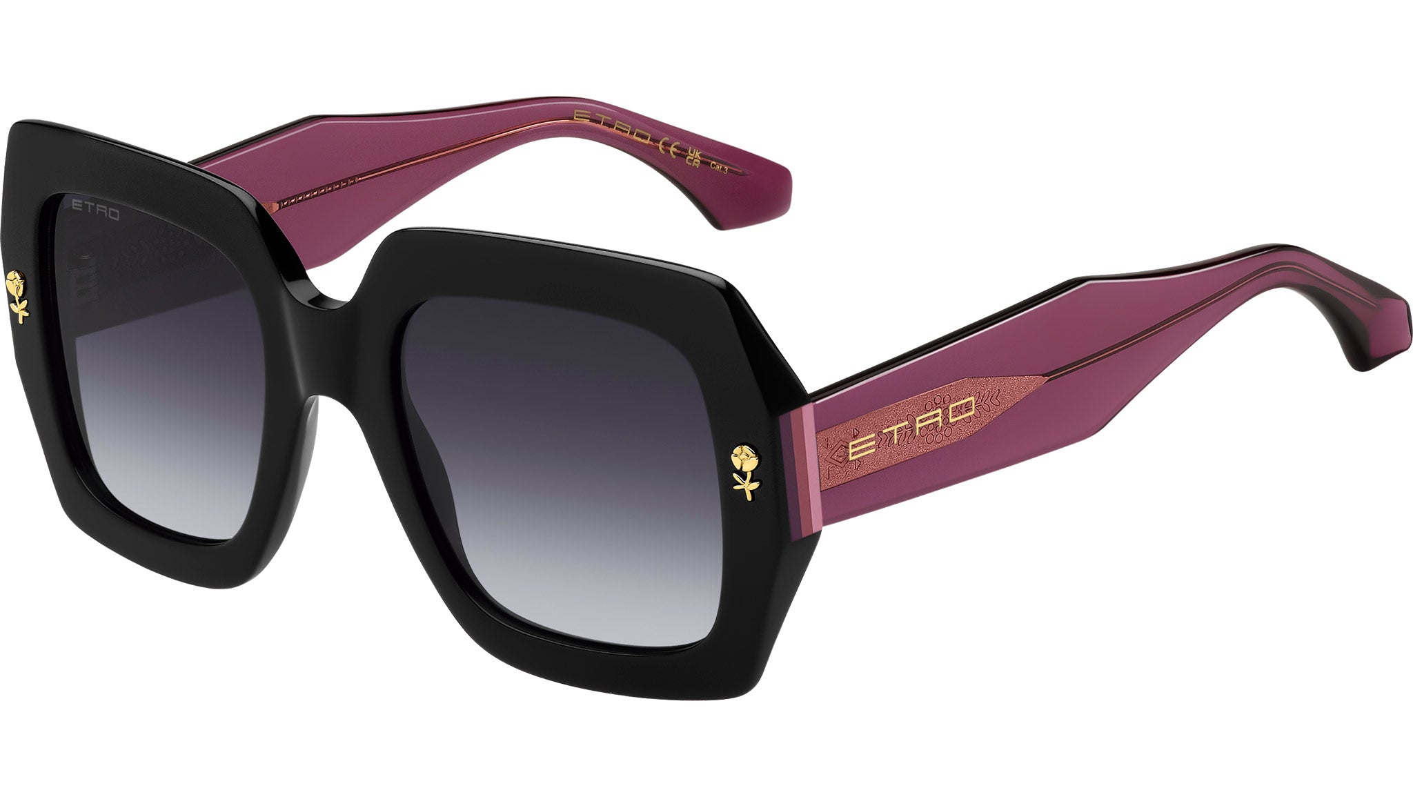 Occhiali da sole Etro 0011/S HK8 9O donna con montatura squadrata in acetato nero viola e lenti in CR-39 grigio scuro sfumato. Un omaggio ai motivi a righe e pattern floreali che contraddistinguono il codici stilistici di ETRO, la collezione eyewear "Colour Stripes" traduce i ricami e le stampe iconiche della Maison in occhiali da vista dall'estetica eclettica e innovativa. La montatura in acetato dai volumi audaci, rifinita con profili smussati, è arricchita da una preziosa decorazione in metallo a forma di fiore e da un inserto a righe multicolore sui lati. L’anima in metallo visibile attraverso le aste trasparenti aggiunge un tocco grafico. Il design dei terminali in acetato richiama la simmetria del logo ETRO. Linea: Etromania. Codice modello: 206849. Codice colore: HK8 9O. Rivenditore autorizzato Etro online. Gli occhiali vengono consegnati con custodia e accessori originali e sono coperti dalla garanzia ufficiale di 12 mesi del produttore.