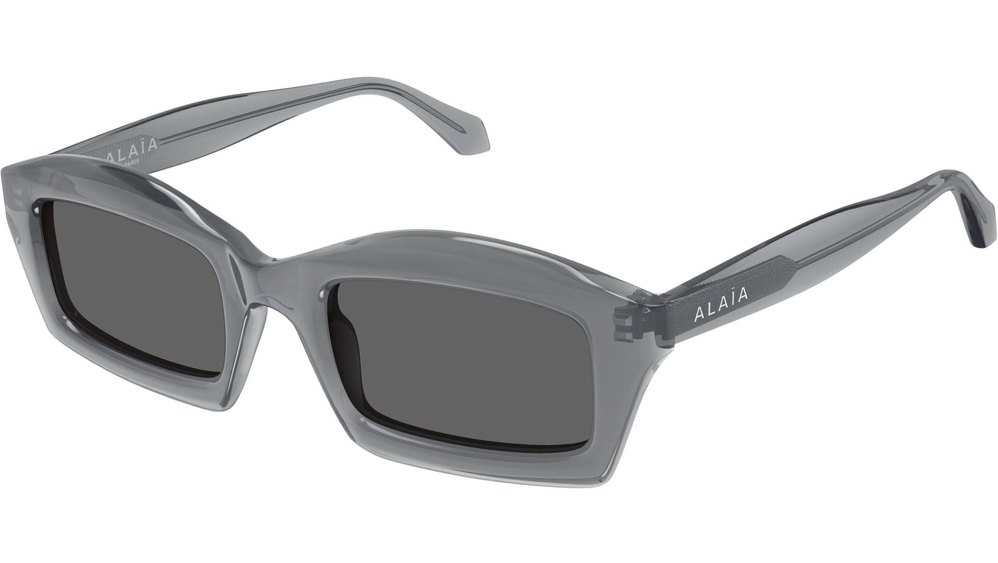 Occhiali da sole Azzedine Alaïa AA0089S 002 donna con montatura rettangolare in acetato riciclato grigio trasparente lucido e lenti grigio fumo tinta unita. Linea: Lettering Logo. Codice modello: AA0089S. Codice colore: 002. Made in Italy. Rivenditore autorizzato Alaïa online. Gli occhiali vengono consegnati con custodia e accessori originali e sono coperti dalla garanzia ufficiale di 12 mesi del produttore.