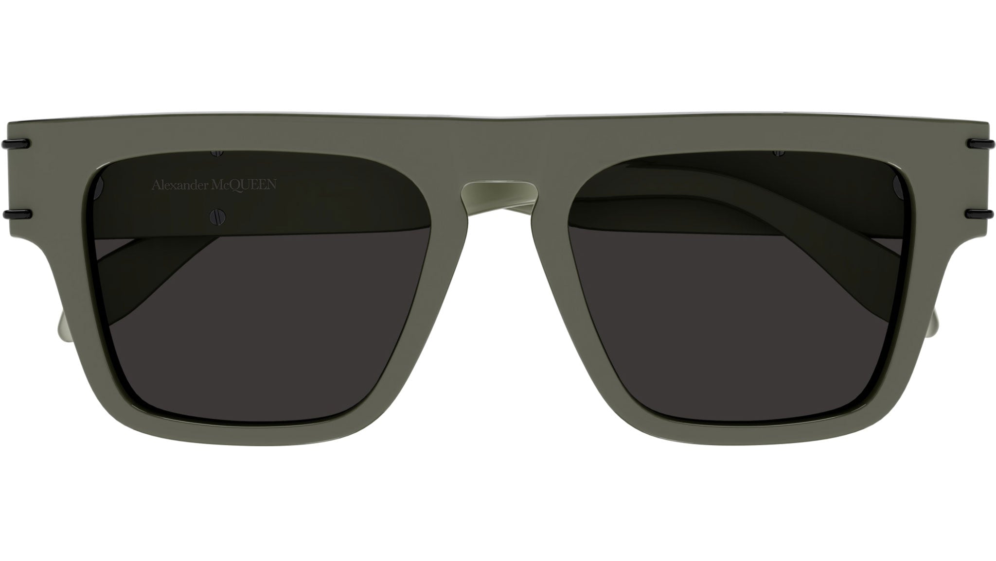 Occhiali da sole Alexander McQueen linea Casual Lines modello AM0397S variante colore 005 verde militare tinta unita lucido con lenti color grigio tinta unita.