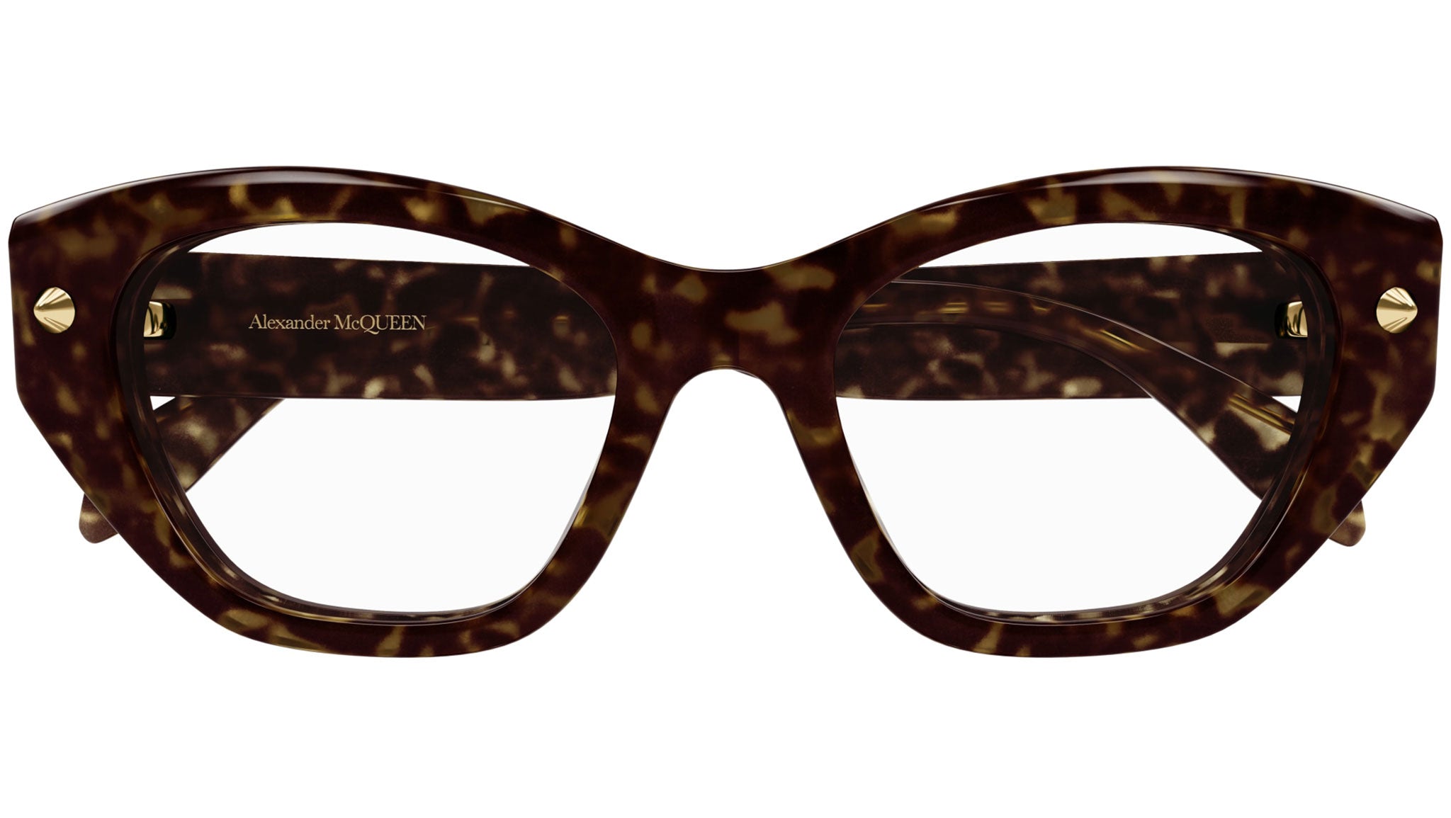 Occhiali da vista Alexander McQueen linea Icons modello AM0410O variante colore 002 tartaruga scuro lucido con astine color tartaruga.
