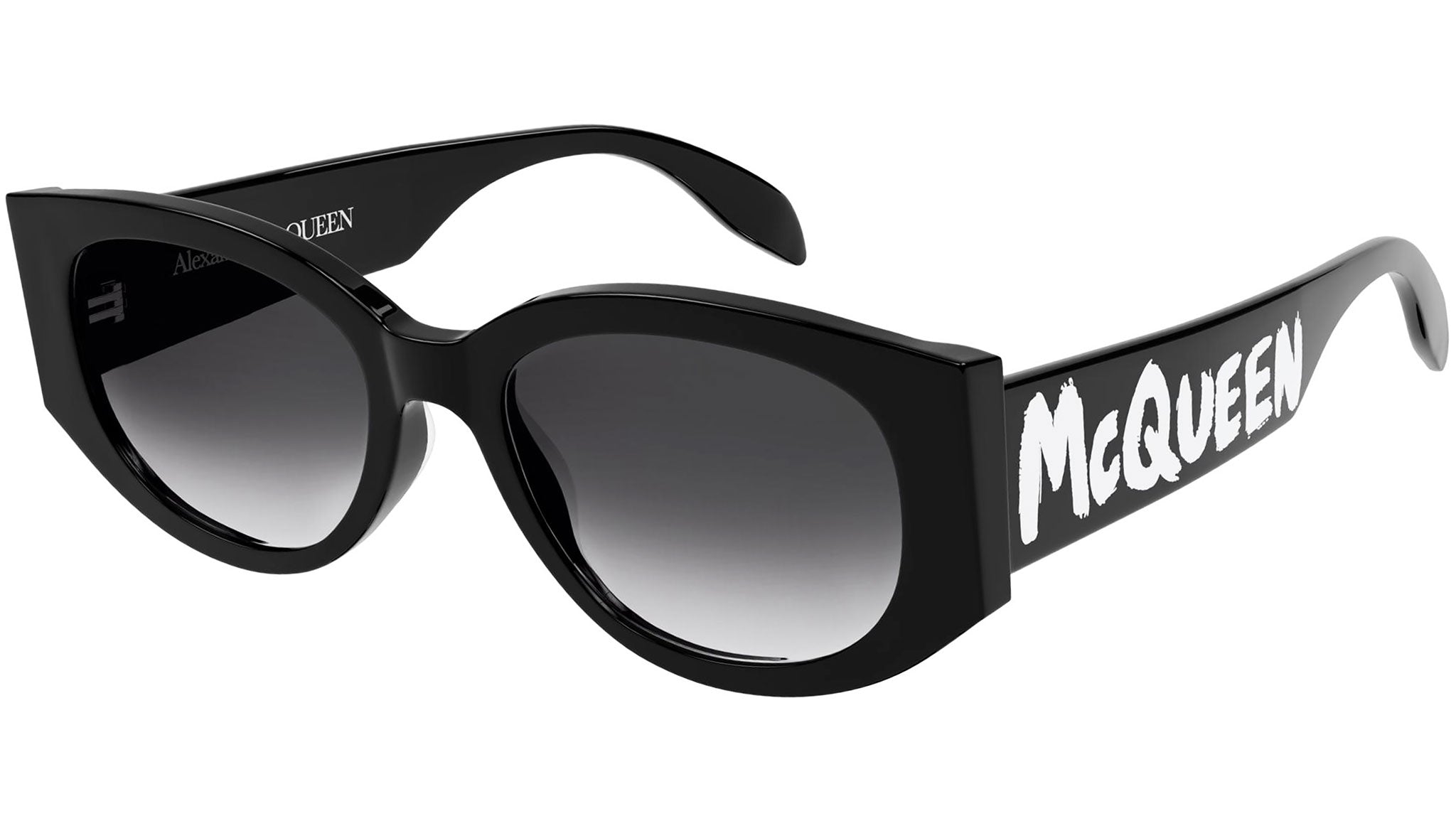 Occhiali da sole Alexander McQueen linea Casual Lines modello AM0330S 001, variante colore nero lucido con lenti color grigio sfumato. Sinonimo di fashion irriverente e senza inibizioni, i modelli Alexander McQueen Eyewear rappresentano la pura giustapposizione tra elementi contrastanti, declinata in modelli da passerella dal segno unico, stimolante e moderno.