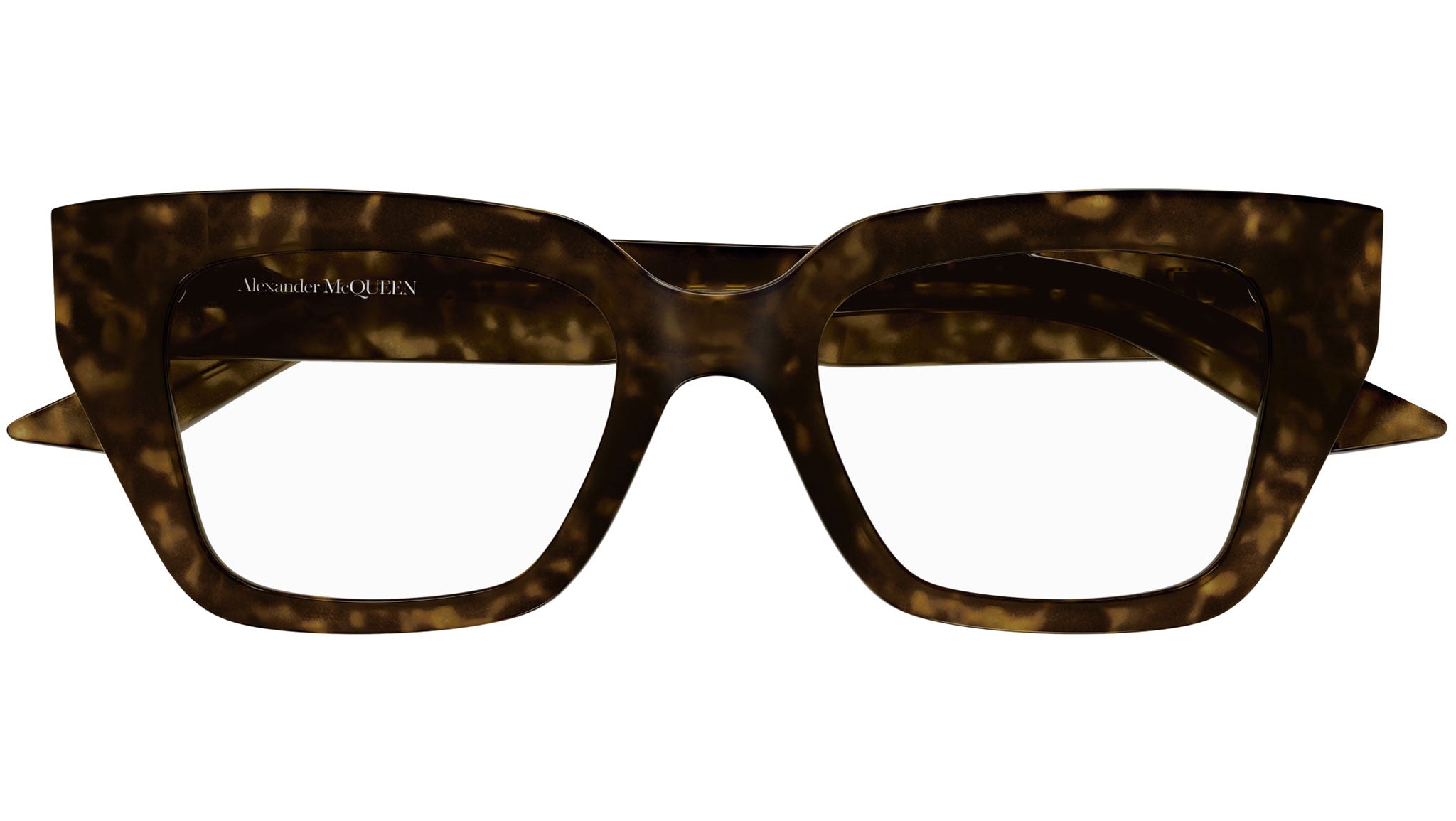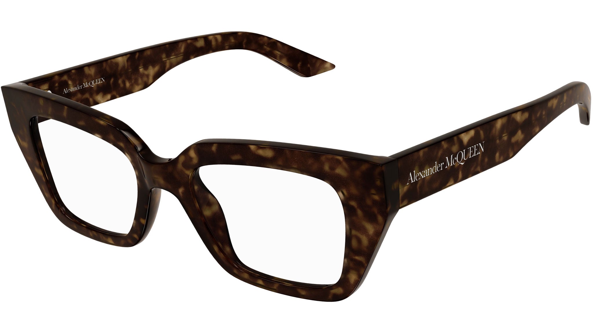 Occhiali da vista Alexander McQueen Casual Lines modello AM0453O cat eye in acetato riciclato codice colore 002 tartaruga scuro lucido con aste tartaruga e lenti demo.