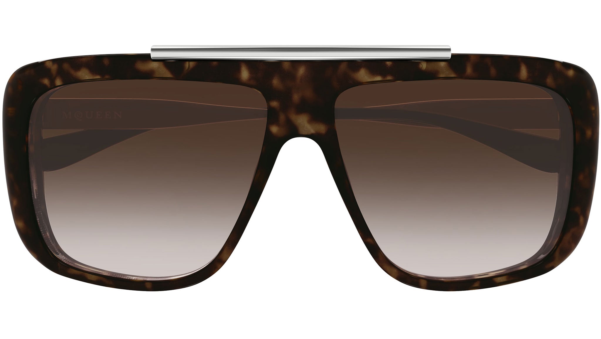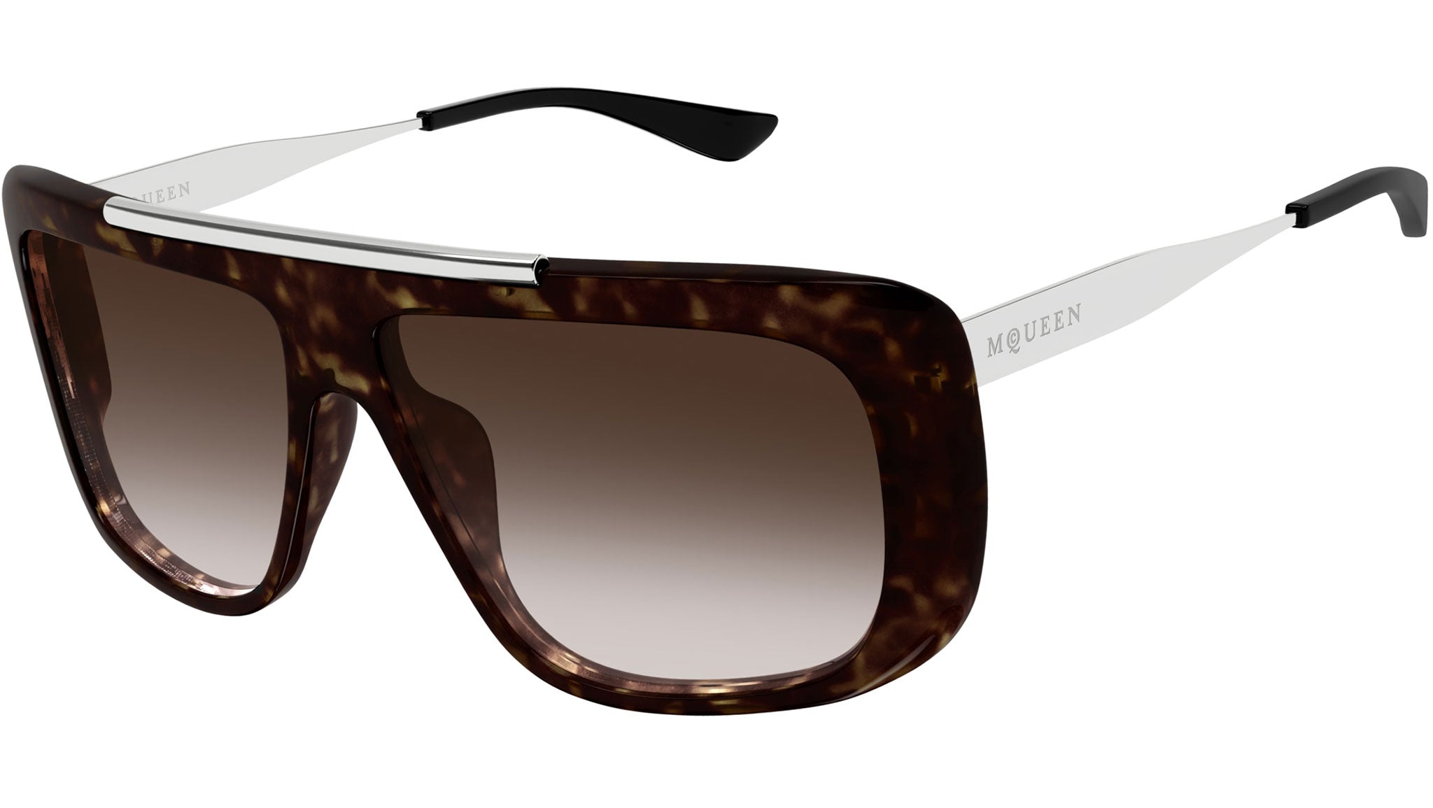 Occhiali da sole Alexander McQueen T-Bar modello AM0492S in acetato riciclato navigator codice colore 003 avana scuro lucido con aste argento e lenti color marrone sfumato. Rivenditore autorizzato Alexander McQueen online. Gli occhiali vengono consegnati con custodia e accessori originali e sono coperti dalla garanzia ufficiale di 12 mesi del produttore.