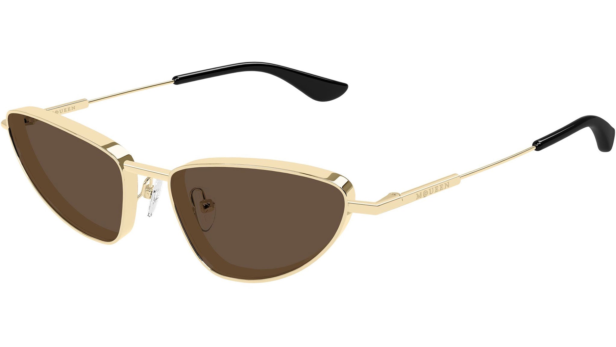 Occhiali da sole Alexander McQueen T-Bar modello AM0522S in metallo cat eye codice colore 002 oro chiaro lucido con aste oro e lenti color marrone tinta unita. Rivenditore autorizzato Alexander McQueen online. Gli occhiali vengono consegnati con custodia e accessori originali e sono coperti dalla garanzia ufficiale di 12 mesi del produttore.