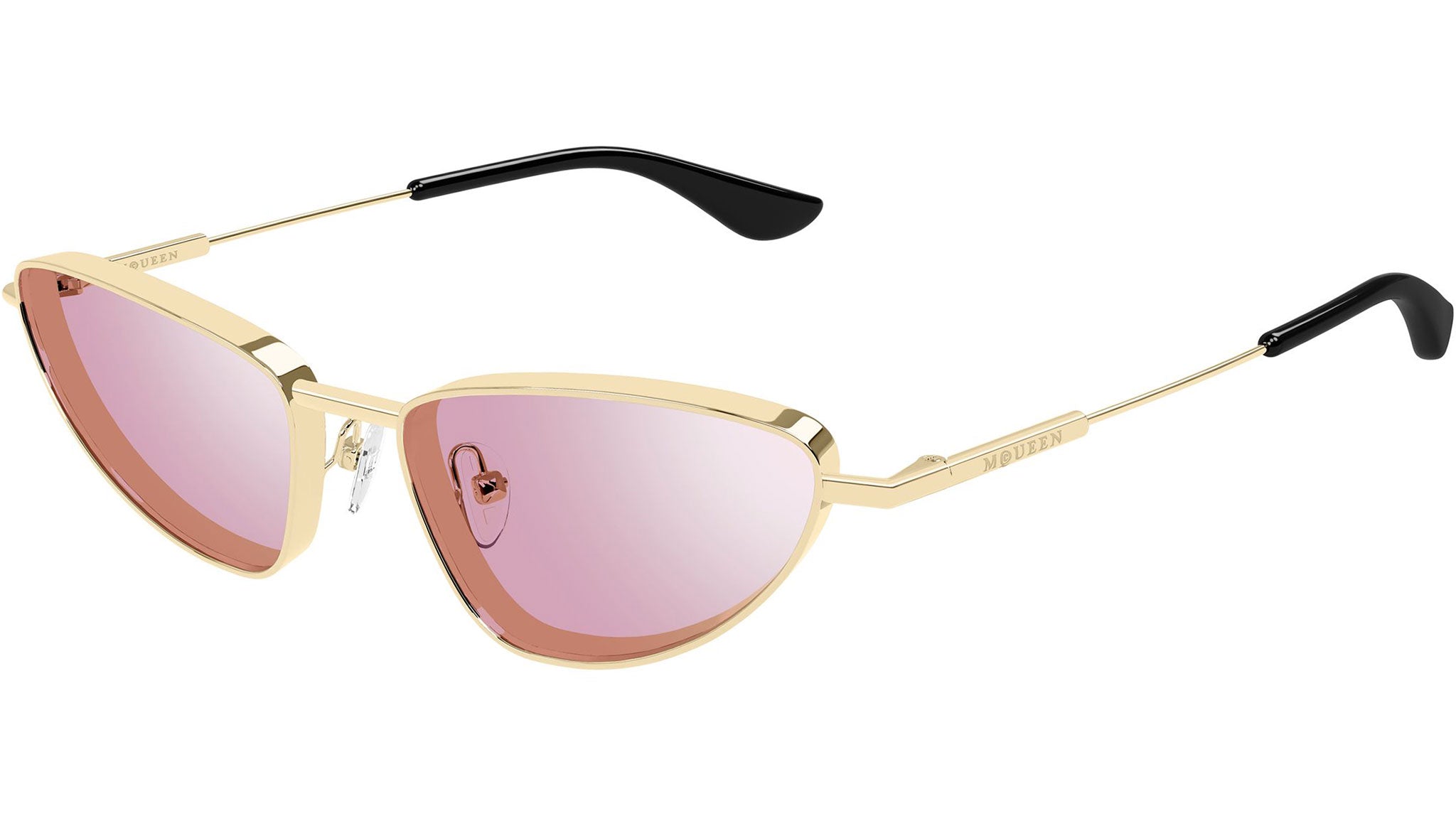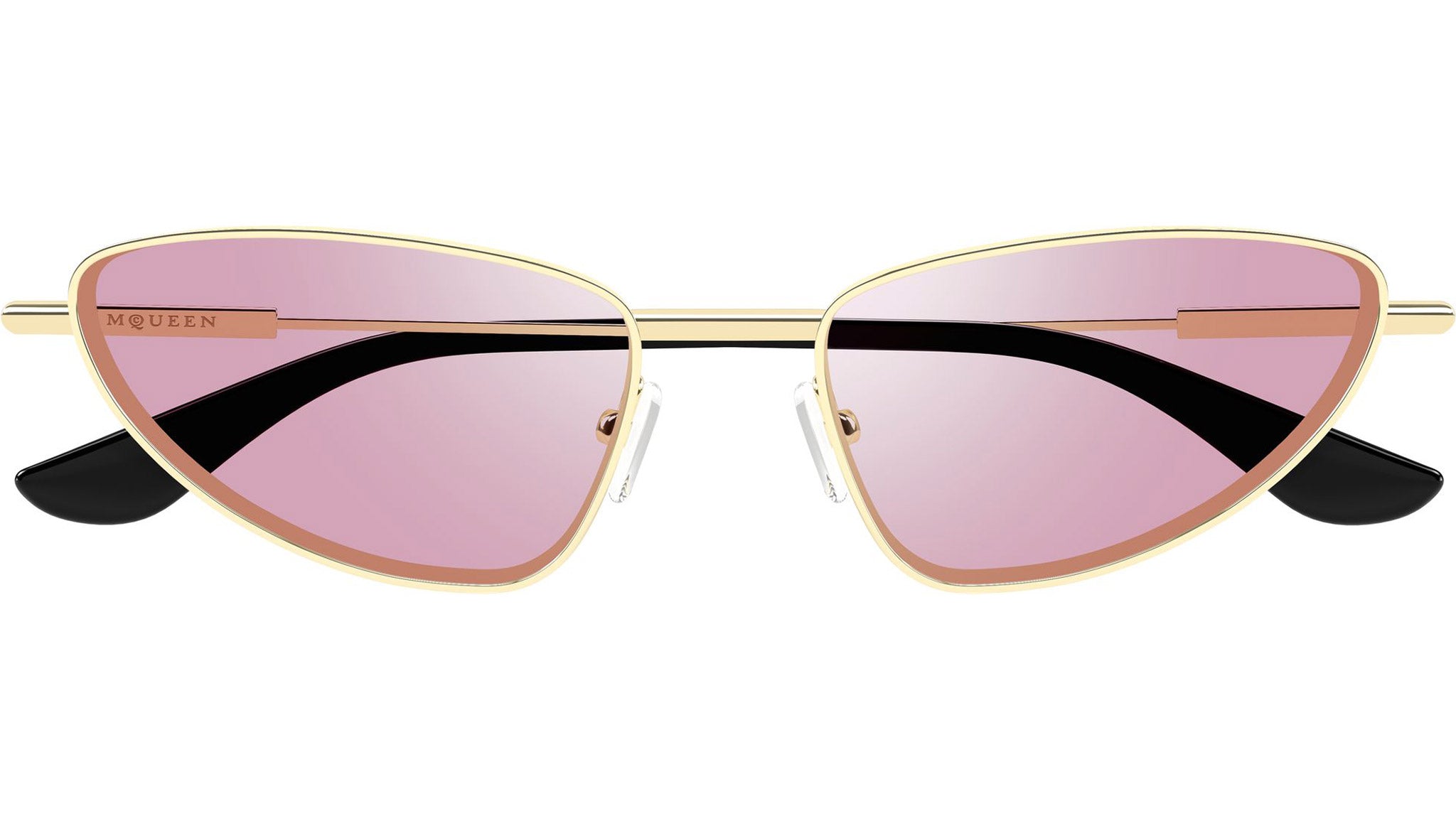 Occhiali da sole Alexander McQueen T-Bar modello AM0522S in metallo cat eye codice colore 004 oro chiaro lucido con aste oro e lenti color rosa solido con flash elettrico. Rivenditore autorizzato Alexander McQueen online. Gli occhiali vengono consegnati con custodia e accessori originali e sono coperti dalla garanzia ufficiale di 12 mesi del produttore.