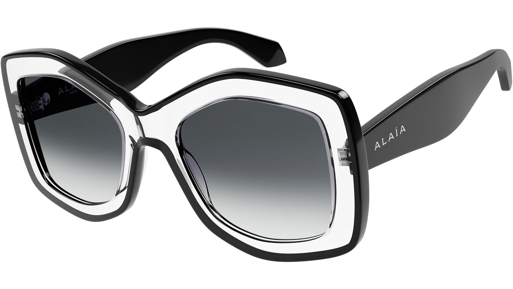 Occhiali da sole Azzedine Alaïa modello AA0066S variante colore 001 nero trasparente lucido con lenti color grigio sfumato.