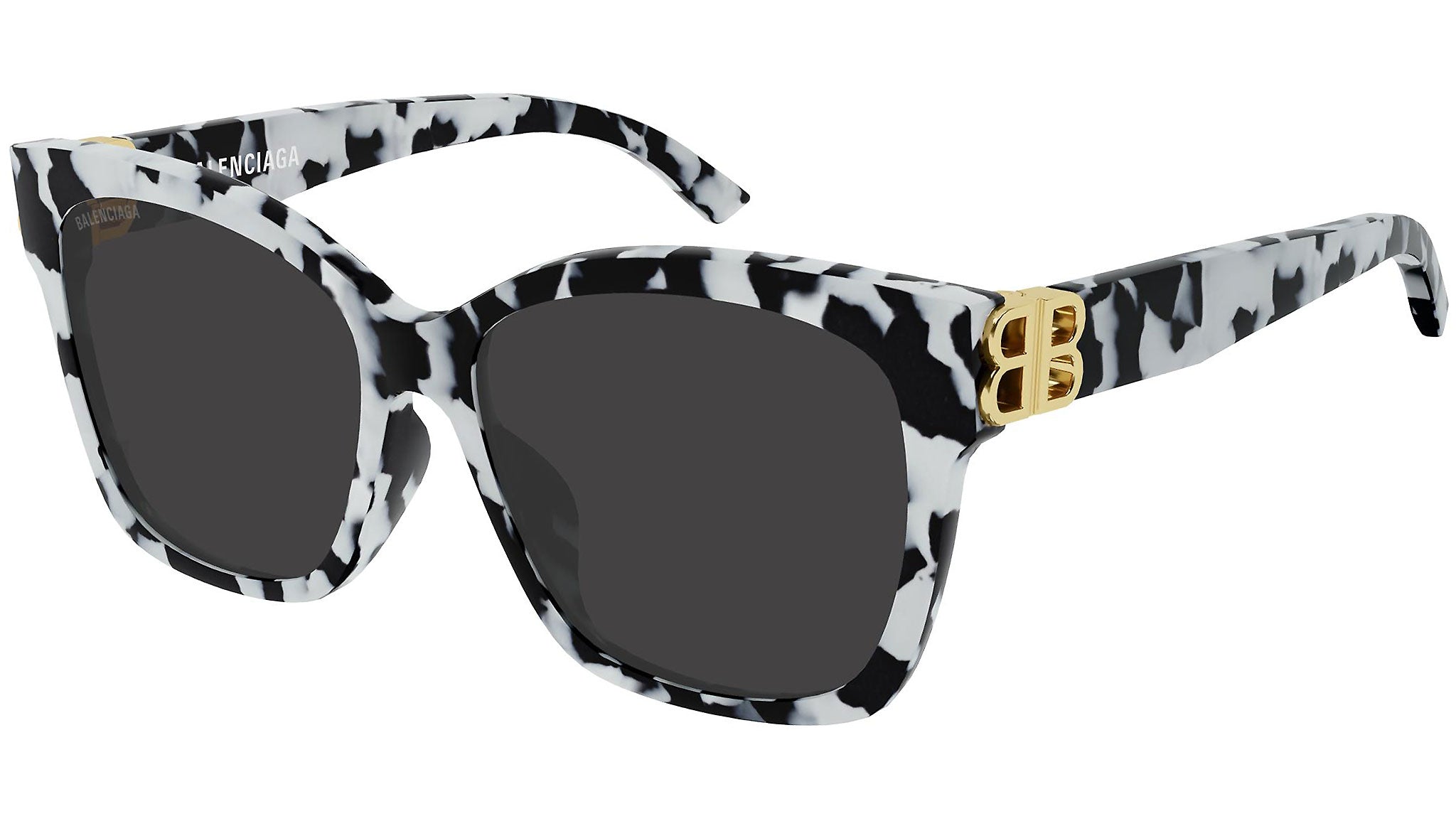 Occhiali da sole Balenciaga linea Everyday modello 0102SA, variante colore 007 nero lucido e avana bianco con lenti color grigio tinta unita.
