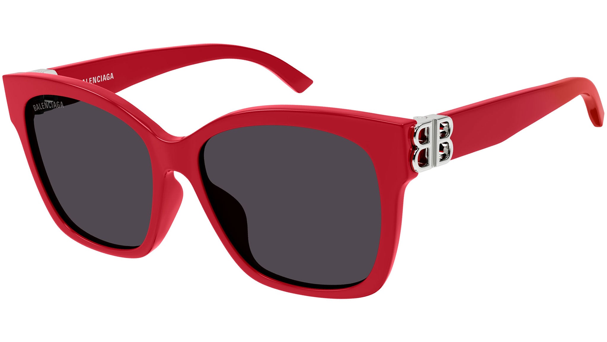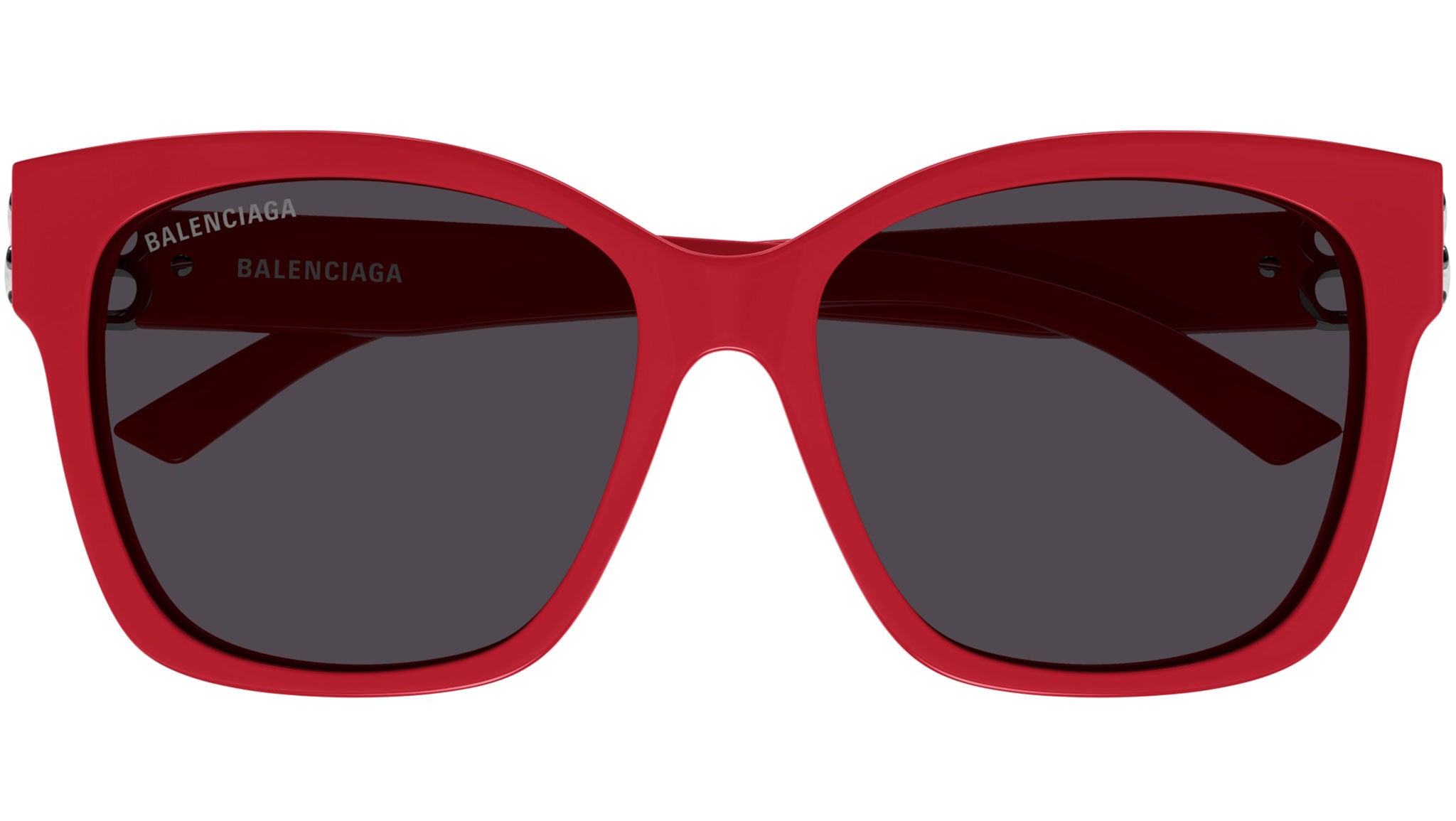 Occhiali da sole Balenciaga linea Everyday BB0102SA codice colore 012 con montatura rosso tinta unita lucido e lenti color grigio tinta unita.