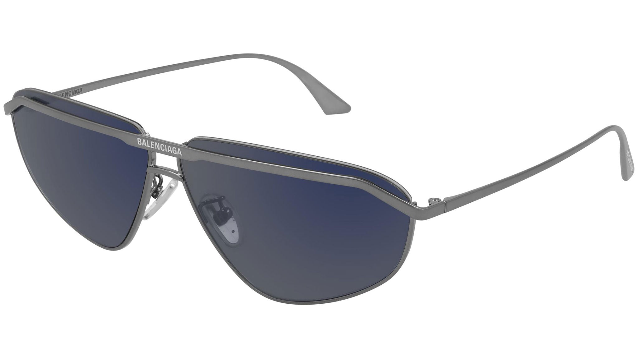 Occhiali da sole Balenciaga linea Everyday modello BB0138S 002, variante colore rutenio scuro lucido con logo bianco con lenti color grigio e blu a specchio.