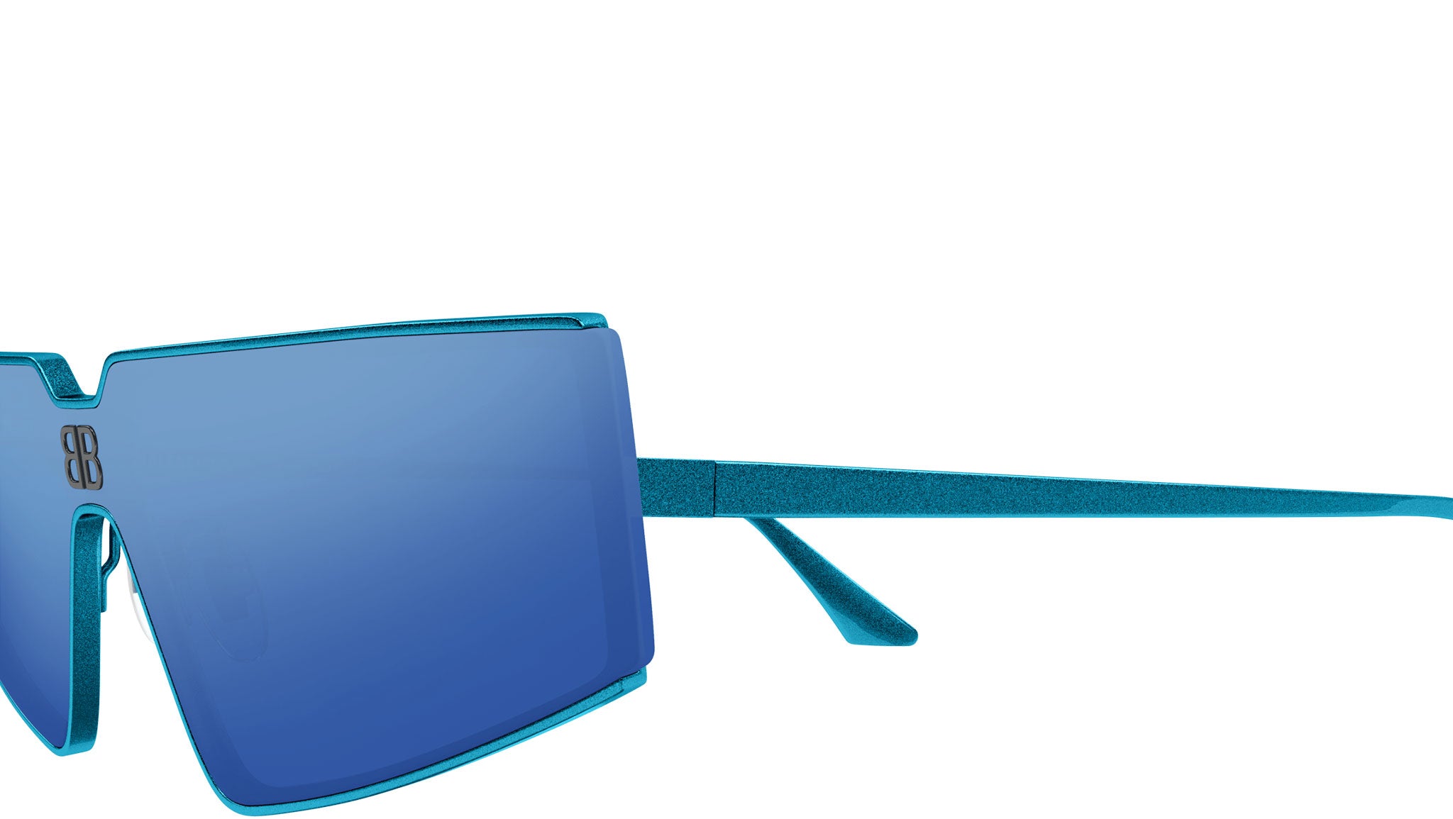 Occhiali da sole Balenciaga linea Everyday modello 0192S, variante colore 003 azzurro metallic lucido con lenti color marrone tinta unita e blu.