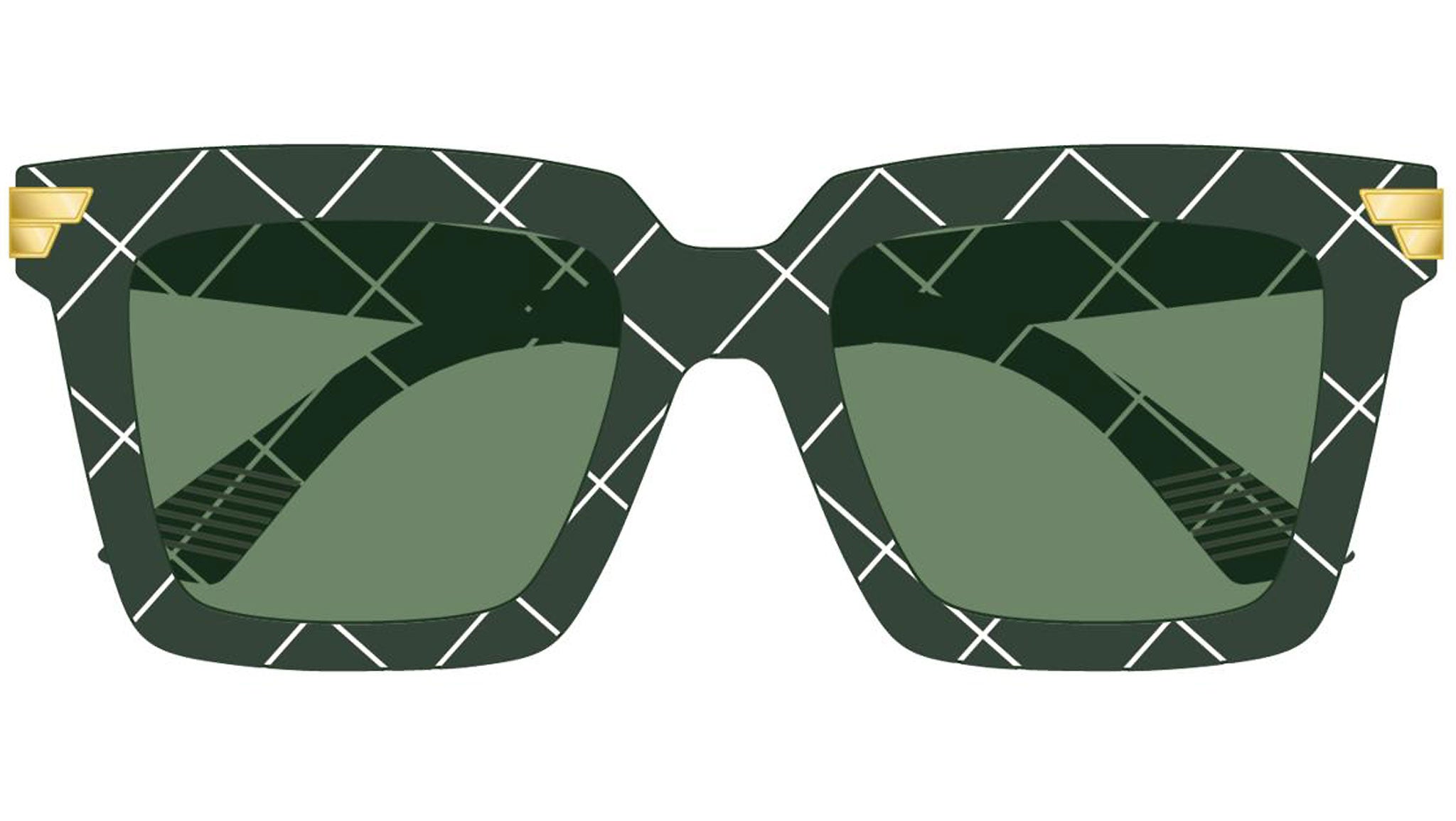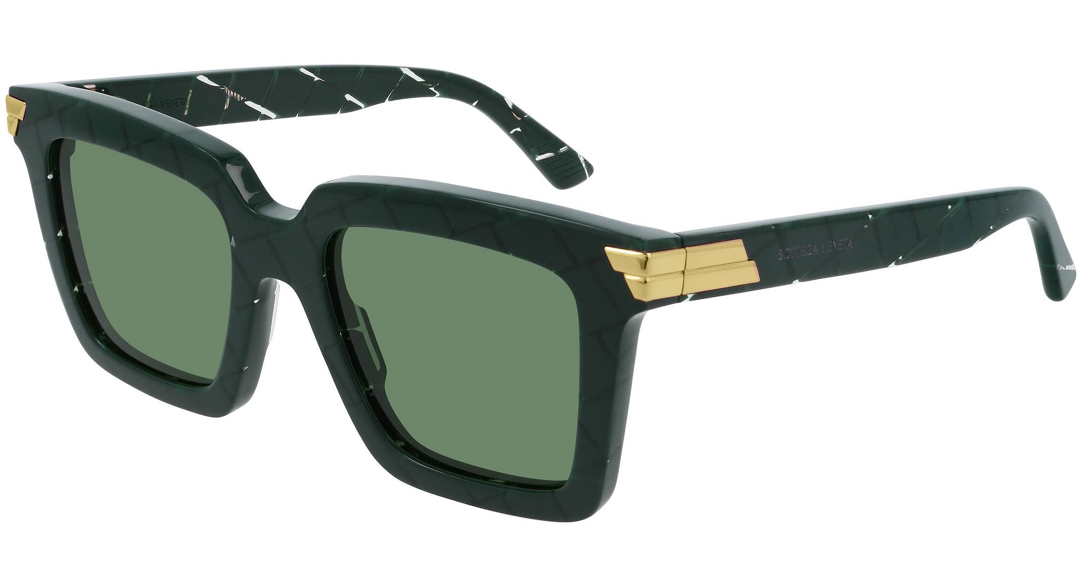 Bottega Veneta Unapologetic sunglasses collection model BV1005S 008 featuring shiny "intreccio" pattern solid green/crystal frame and solid green lens. Inspired by Italian culture with a global outlook, the House is defined by a distinctly refined attitude. Bottega Veneta uses noble materials to create considered pieces that become part of their owner’s lives.