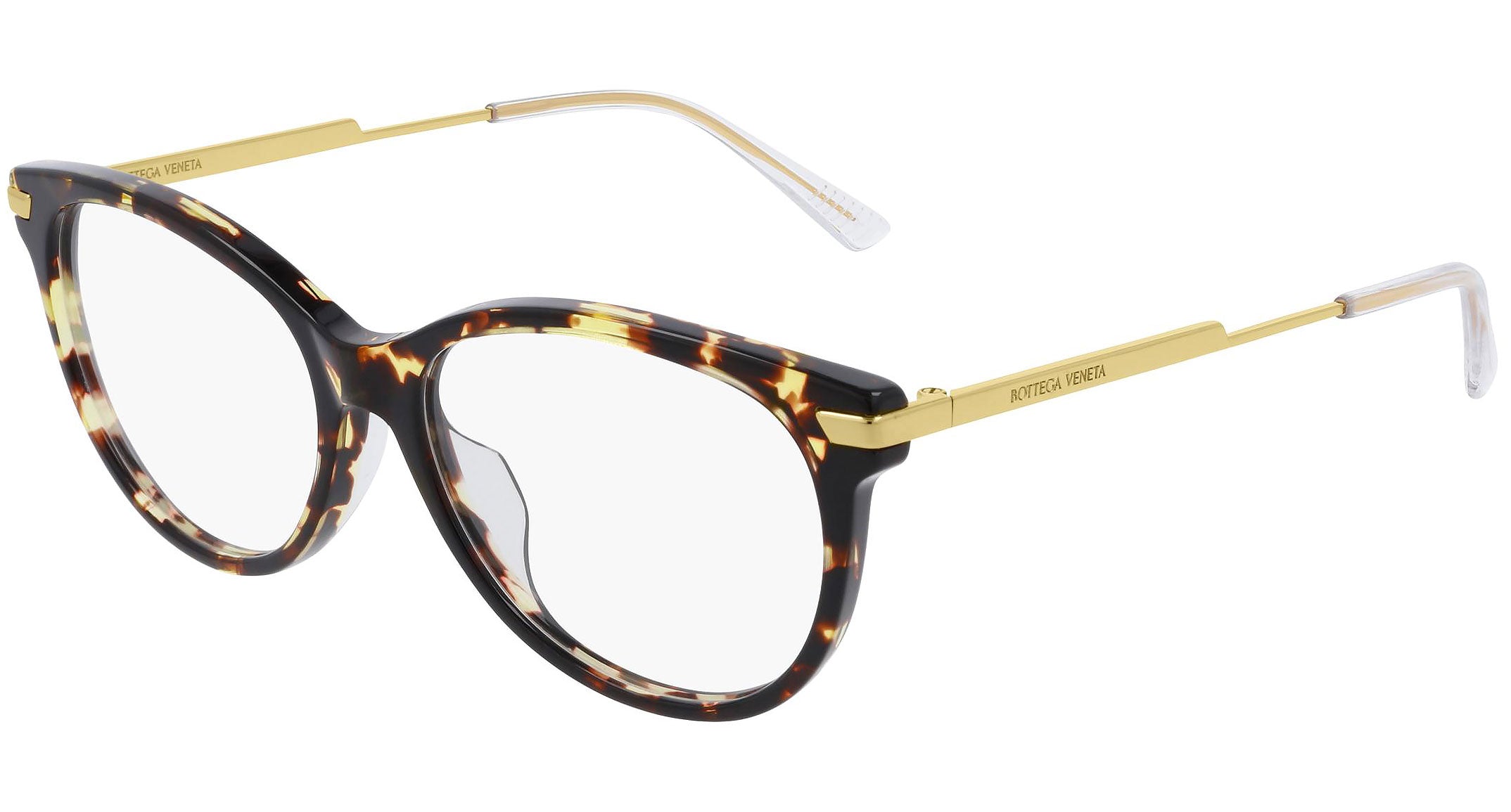 Occhiali da vista Bottega Veneta linea Minimalist variante colore 002 avana lucido e oro lucido con astine color oro.