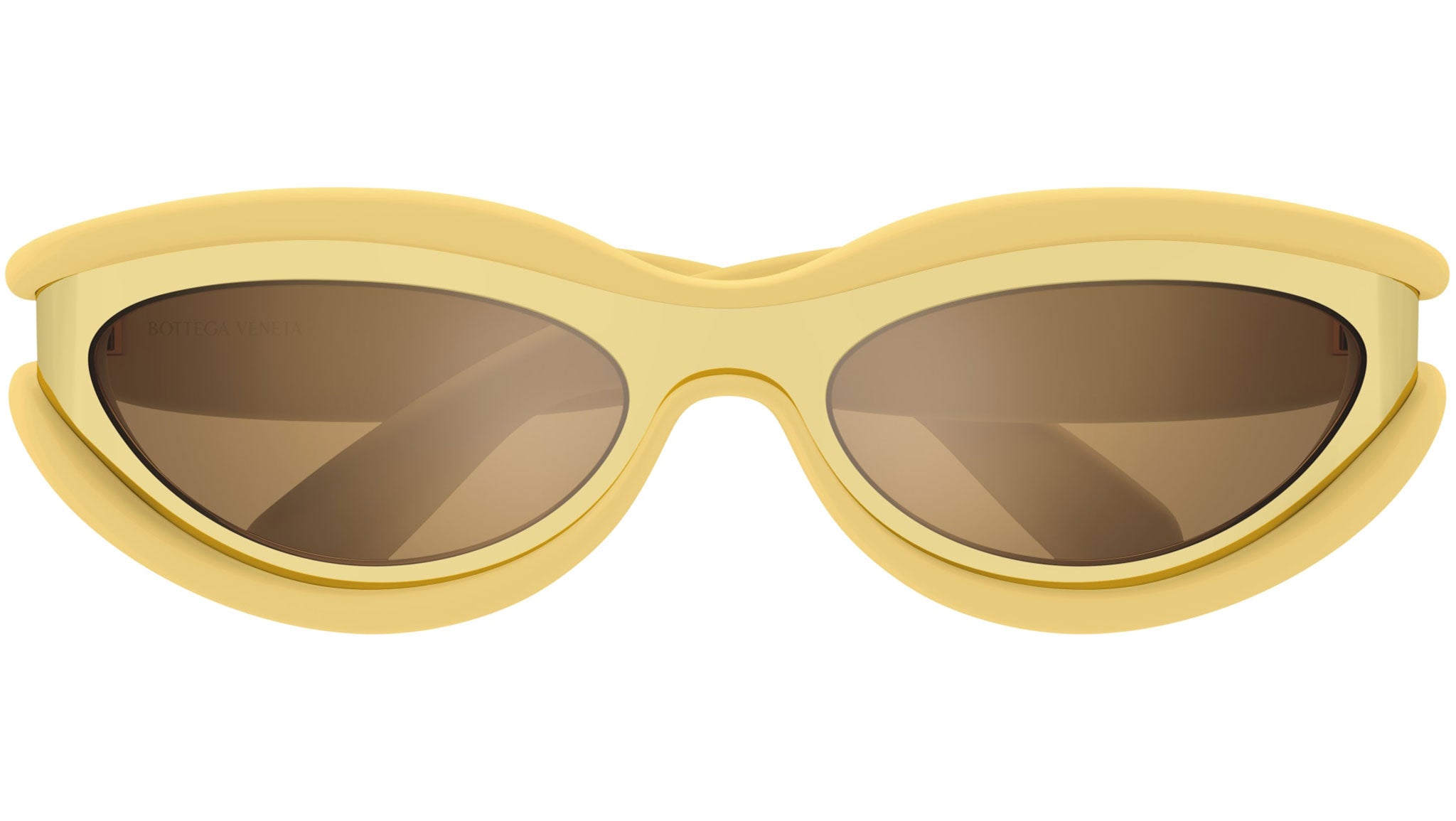 Occhiali da sole Bottega Veneta linea Unapologetic modello BV1211S variante colore 005 oro metal e tapioca effetto gomma con lenti color marrone + electric flash tinta unita.