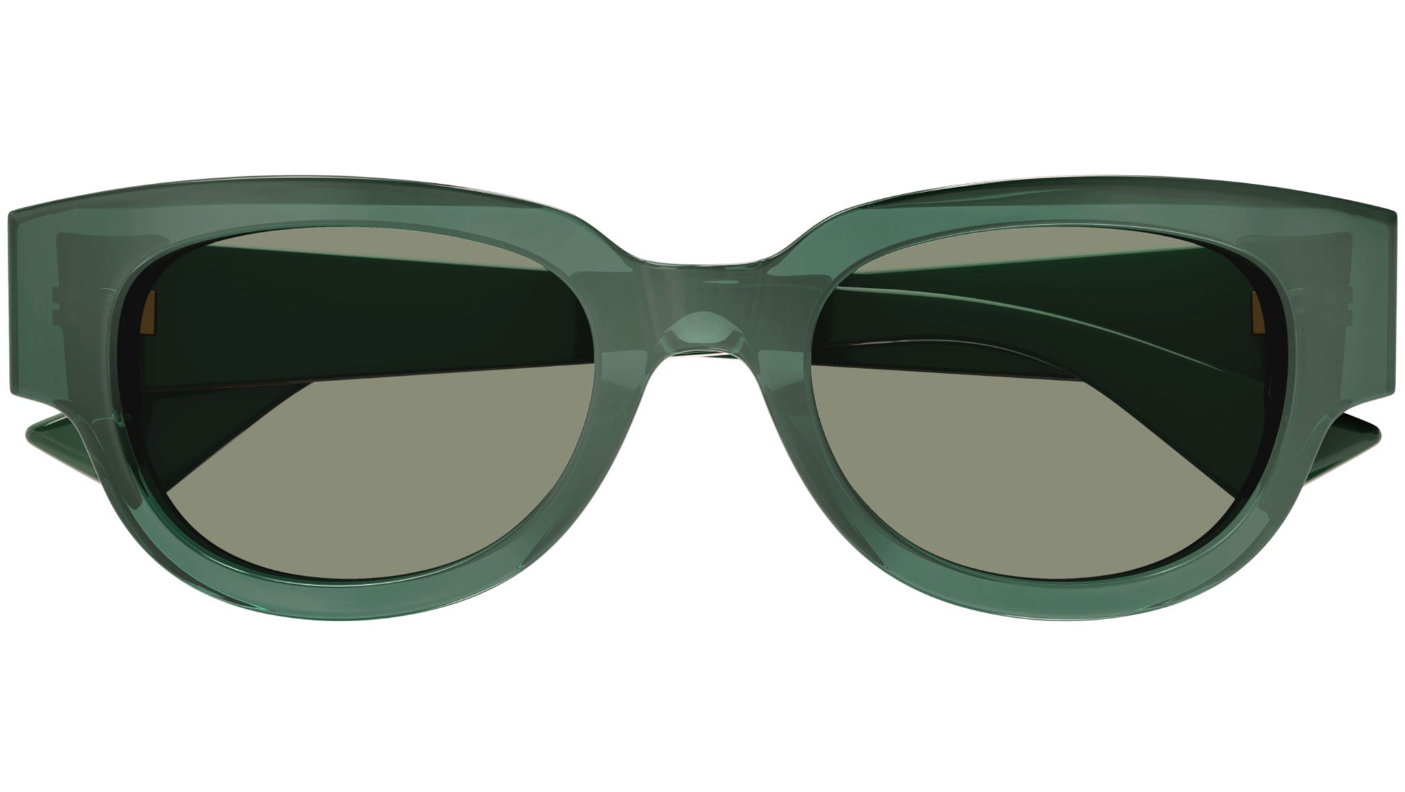 Occhiali da sole Bottega Veneta modello BV1278SA linea New Classic codice colore 003 verde bottiglia trasparente lucido in acetato riciclato forma cat eye con lenti color verde tinta unita.