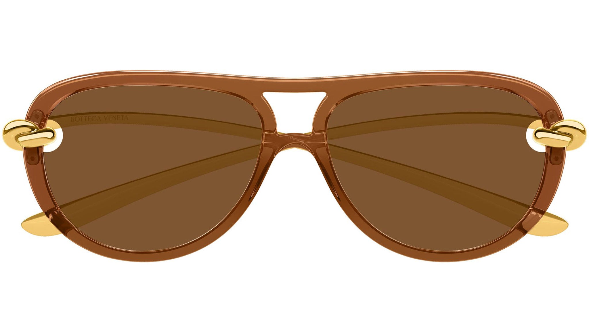 Occhiali da sole Bottega Veneta BV1418S 004 donna con montatura aviatore in inietatto marrone pan di zenzero trasparente lucido e lenti marrone tinta unita. Linea: Signature Icons. Codice modello: BV1418S. Codice colore: 004. Made in Japan. Rivenditore autorizzato Bottega Veneta online. Gli occhiali vengono consegnati con custodia e accessori originali e sono coperti dalla garanzia ufficiale di 12 mesi del produttore.