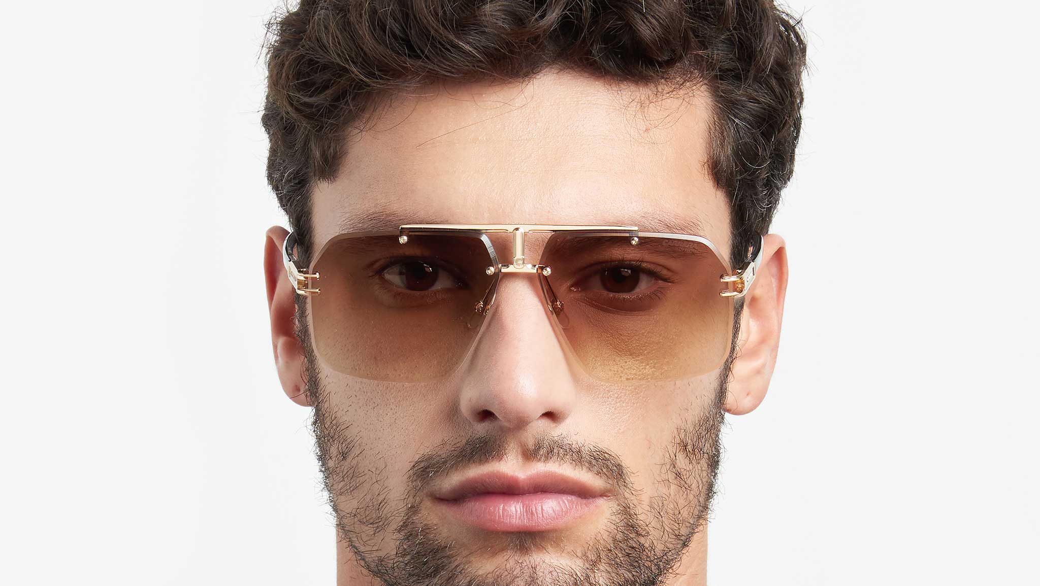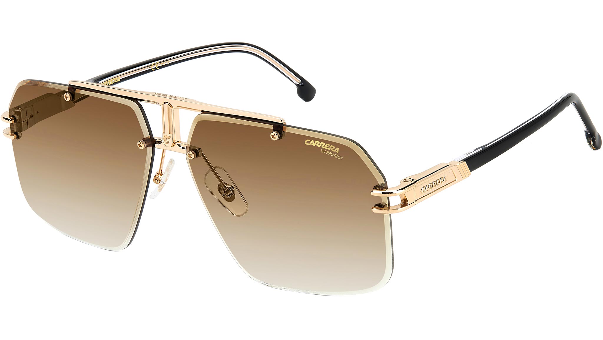 Occhiali da sole Carrera modello 1054/S colore 2M2 86 black gold. Il design non convenzionale di questi occhiali da sole Carrera conquista i collezionisti e i cultori dello stile. La montatura rimless concede totale protagonismo alle lenti, le viti a vista diventano un elemento sia funzionale che decorativo. La placca centrale con la “C” Carrera e le aste a forchetta - con logo scolpito in altorilievo e terminali lunghi in acetato – aggiungono un’ulteriore dose di carattere a questo modello dall’attitudine bossy.