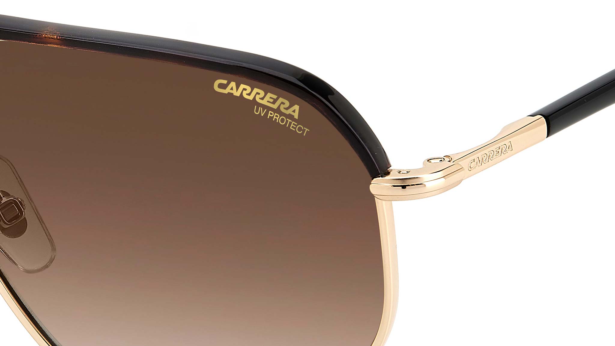 Occhiali da sole Carrera modello 304/S colore 06J HA gold havana. Attingono dall’archivio Carrera questi occhiali da sole in equilibrio tra fascino vintage e avanguardia. La montatura in metallo è caratterizzata dalla struttura a doppio ponte rivestita da una guaina in acetato, e terminali lunghi anche in variante multistrato, per un effetto bicolor intenso e distintivo. Il modello si indossa con piacere: presenta aste sottili, naselli regolabili, e può montare lenti graduate, anche polarizzate e Ultrapolar, per un occhiale dall'elevato valore tecnico.