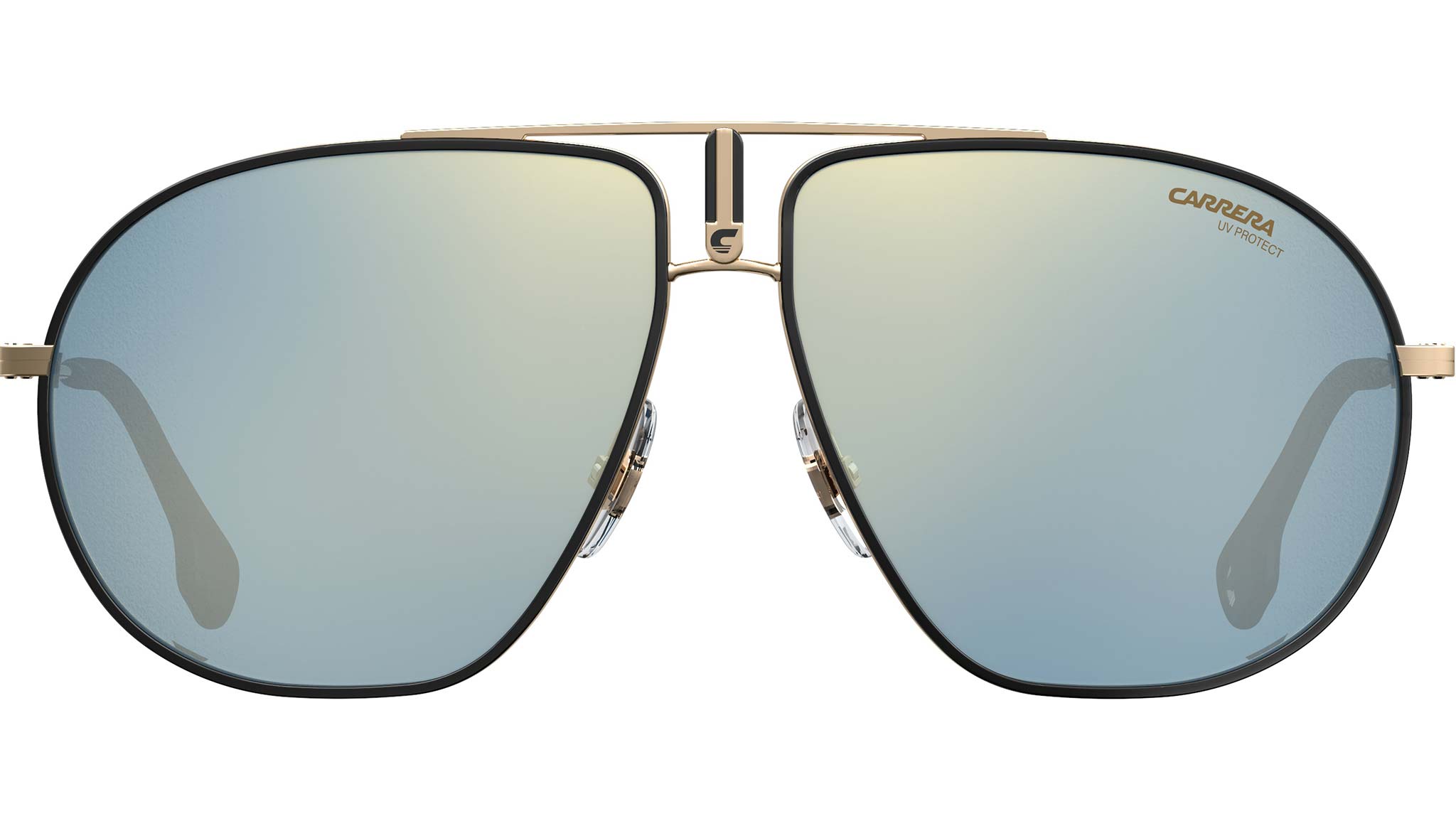 Le collezioni eyewear Carrera hanno lo sport nel proprio DNA e gli occhiali da sole Bound non fanno eccezione. Mentre la silhouette aviator è un classico senza tempo, la nuova variante colore proposta per la Primavera/Estate 2019 – un mix di metallo oro con finali in acetato nero e lenti a specchio blu – da una sferzata di energia giovanile. Il distintivo doppio ponte con il logo C e il monogramma abbinato all’interno del terminale sinistro, assicurano alla montatura classica una personalità sobria. Il risultato è un mix unico, raffinato ed inequivocabilmente Carrera.
