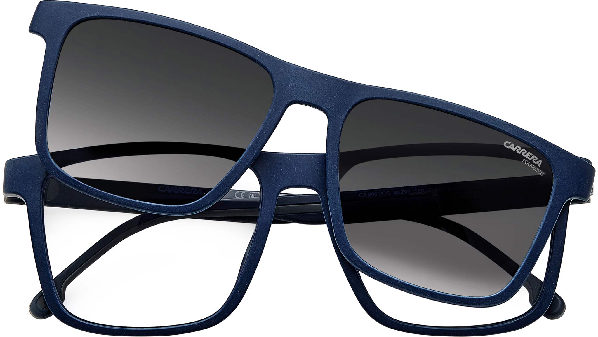 Occhiali da sole Carrera modello CA8061/CS colore 4NZ WJ matte blue grey. Stiloso e innovativo, questo occhiale da vista è ricco di caratteristiche tecniche che donano comfort estremo. La montatura garantisce aderenza e perfetta vestibilità grazie alla tecnologia della poliammide bi-iniettata, declinata in doppia colorazione sulle aste, tocco distintivo Carrera. Il modello monta lenti da sole clip-on polarizzate, che si agganciano al frontale con dei magneti, per affrontare le giornate di sole con invidiabile scioltezza.