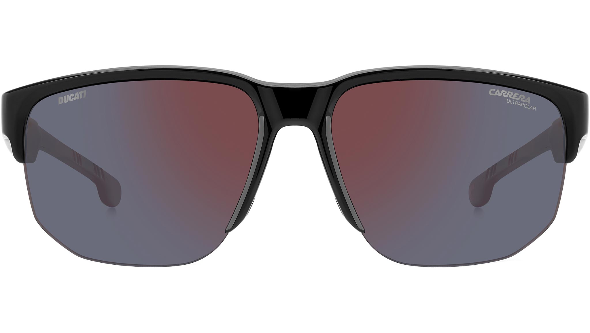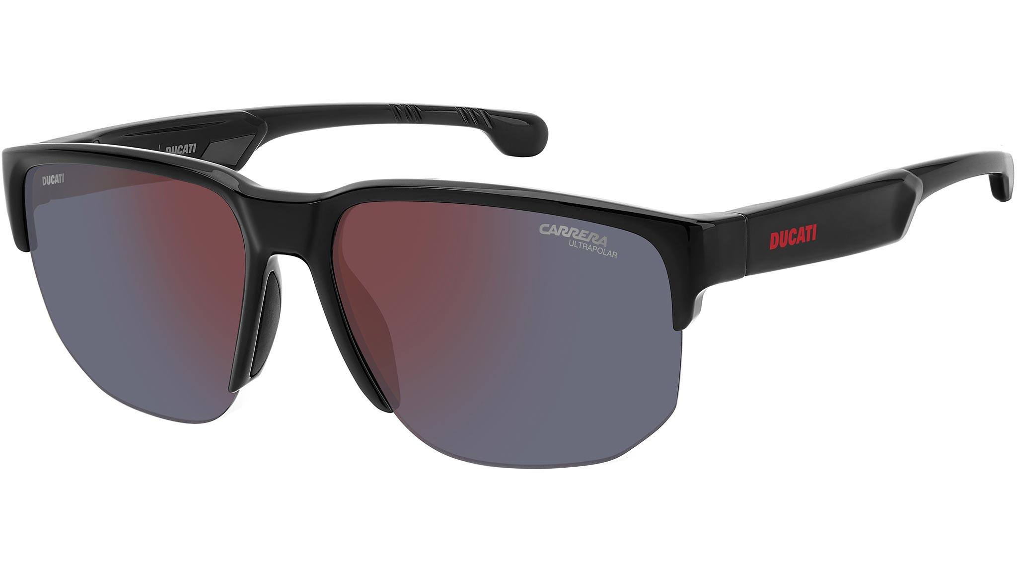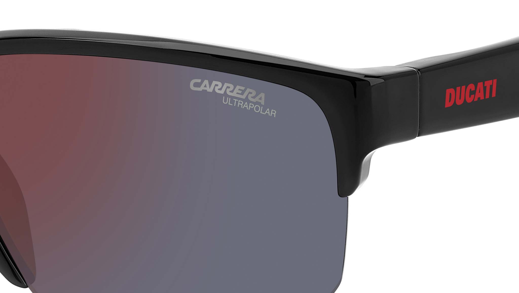 Occhiali da sole Carrera Ducati modello CarDuc 028/S colore 807 H4 black. La passione per la velocità su due ruote si esprime con questi occhiali da sole Carrera | Ducati. Le aste aerodinamiche omaggiano la Panigale, il loro design diritto e i terminali in gomma lucida facilitano l’utilizzo sotto il casco. Il frontale a mezza montatura è disponibile anche con lenti specchiate o con tecnologia ultrapolar, per una visione definita anche su strada.