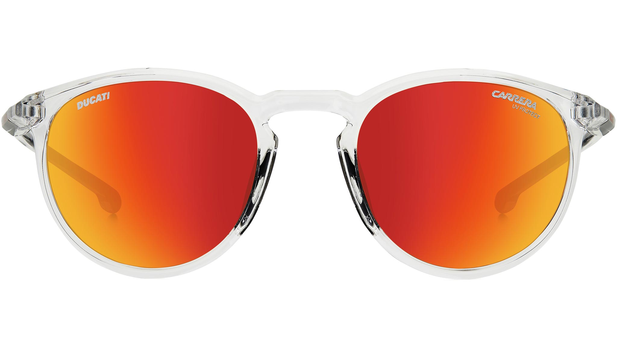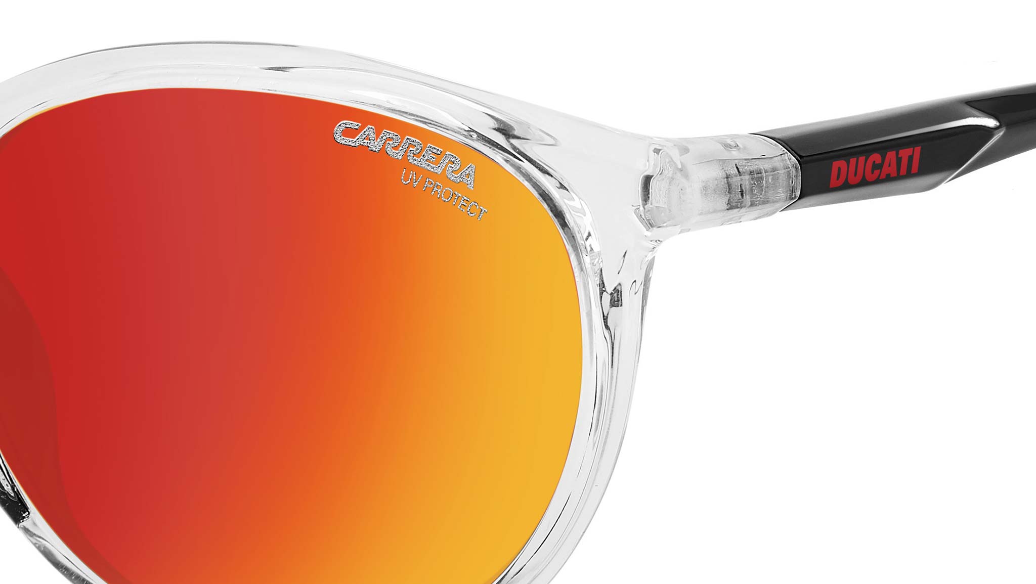 Occhiali da sole Carrera Ducati modello CarDuc 035/S colore 900 UZ crystal. Scendono in pista con stile questi occhiali da sole Carrera | Ducati. Il frontale pantos con ponte a chiave sta benissimo alla maggior parte dei volti, anche alla donna che vuole osare un look sportivo. Le aste omaggiano il design della Panigale, mentre i volumi ridotti e i terminali in gomma lucida facilitano l’utilizzo sotto al casco. Guardare lontano è facile con le lenti graduate, anche specchiate o polarizzate.