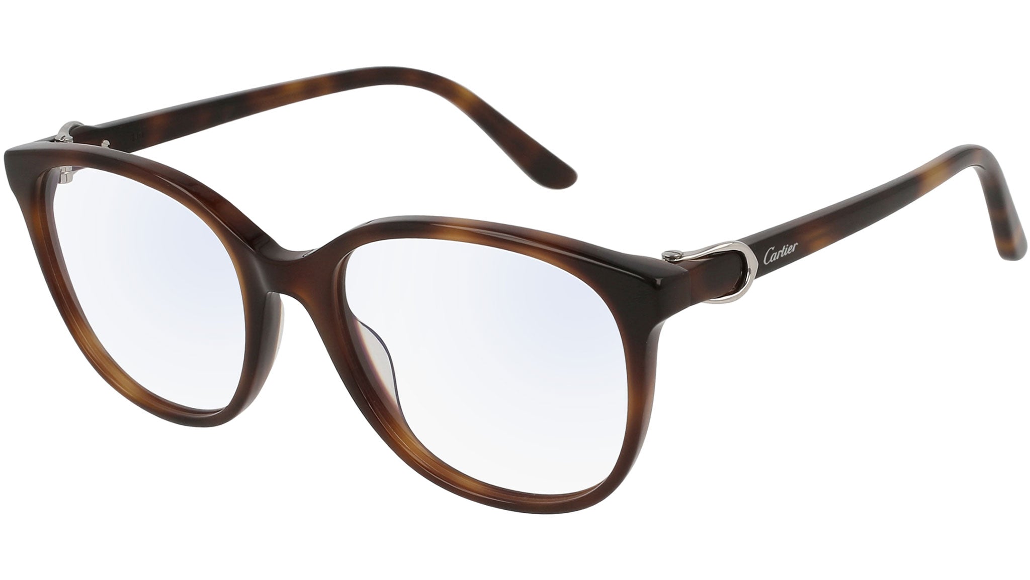 Occhiali da vista Cartier linea Initiation modello CT0007O in acetato pantos codice colore 003 avana medio lucido con aste tartaruga e lenti demo con filtro antiriflesso blu interno.
