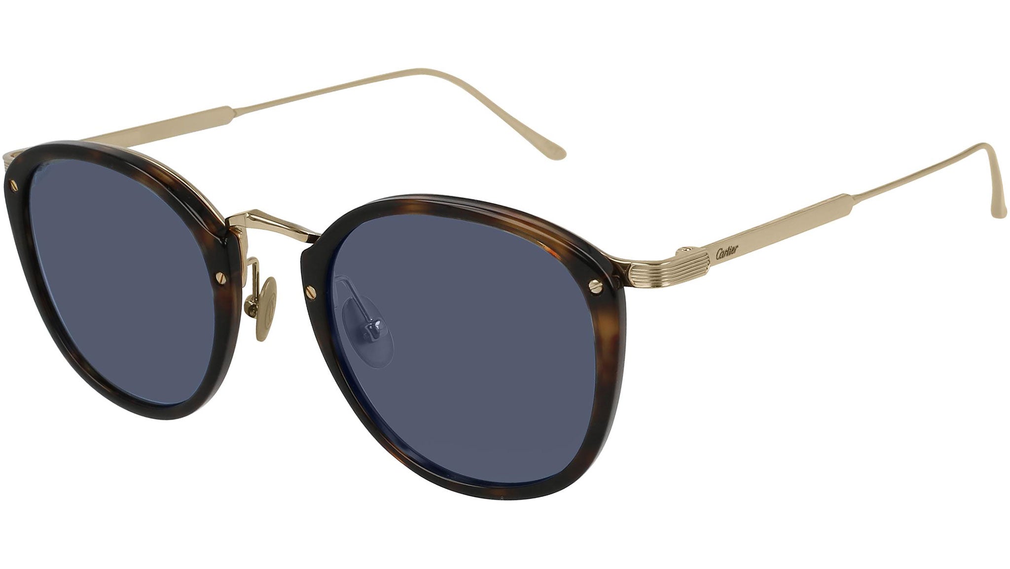 Occhiali da sole Cartier Core Range modello CT0014S 005, variante colore avana scuro lucido / oro pallido con lenti color blu tinta unita + blu. Fondata nel 1847, Maison Cartier non è solo uno dei nomi più affermati nel mondo della gioielleria e dell'orologeria, ma anche il punto di riferimento del più moderno concetto di lusso contemporaneo. Cartier crea occhiali eccezionali, declina ogni design traendo ispirazione dai tratti distintivi del proprio vocabolario iconico, guidato da una vision stilistica chiara, dalla creatività più distintiva, e da un savoir-faire eccezionale.