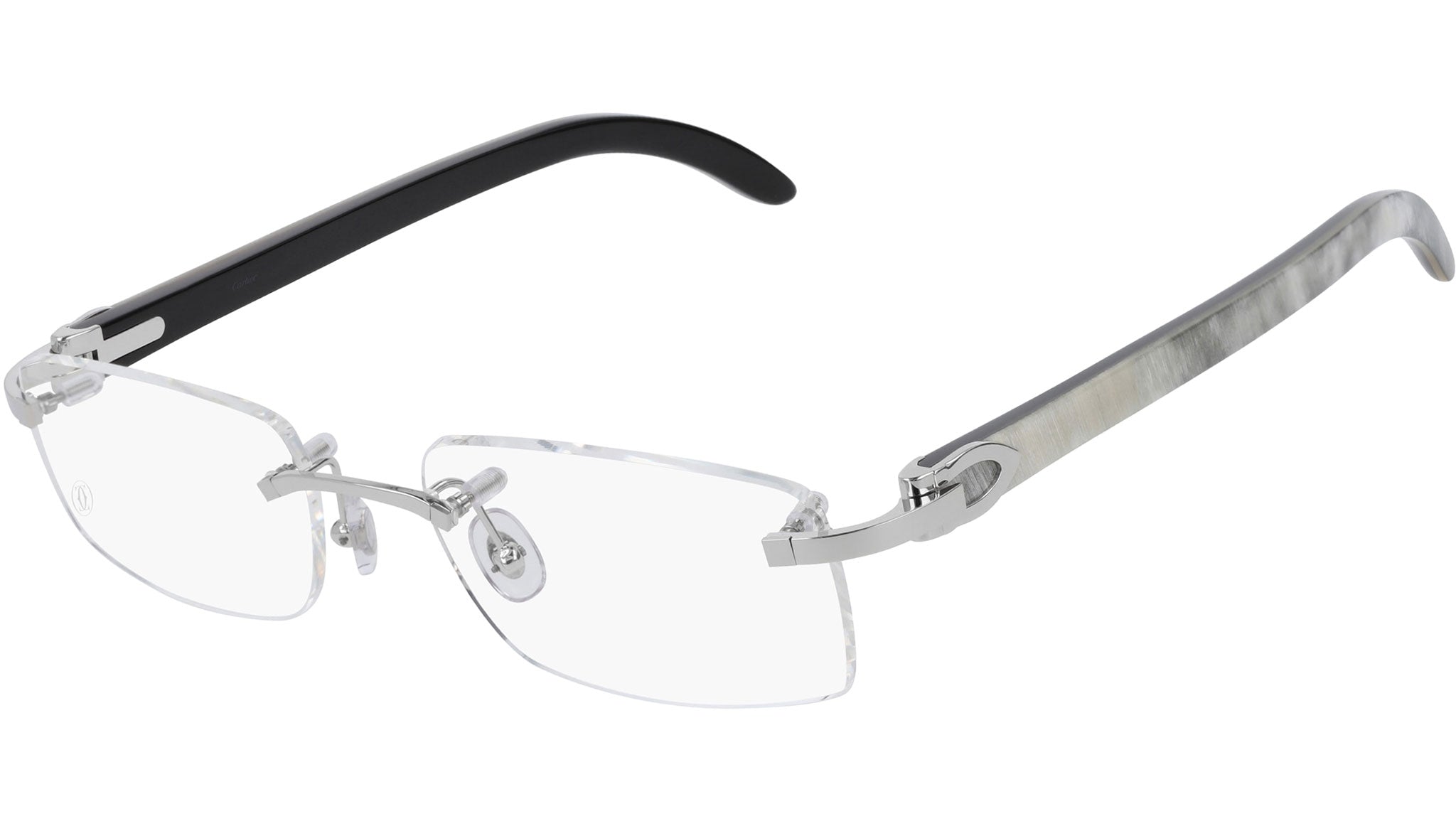 Occhiali da vista Cartier linea Exception modello CT0046O variante colore 002 platino lucido con astine color bianco.