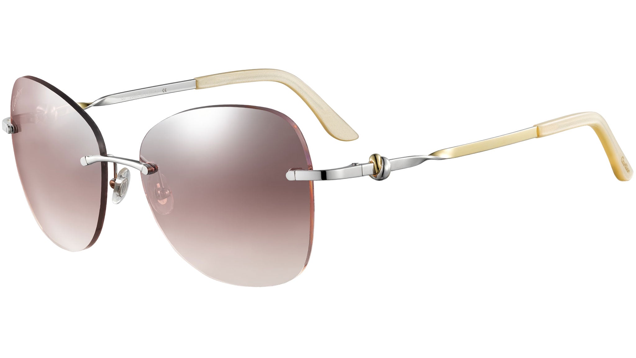 Occhiali da sole Cartier linea Core Range modello CT0091S in metallo a gatto codice colore 003 argento lucido con aste argento e lenti rosa.