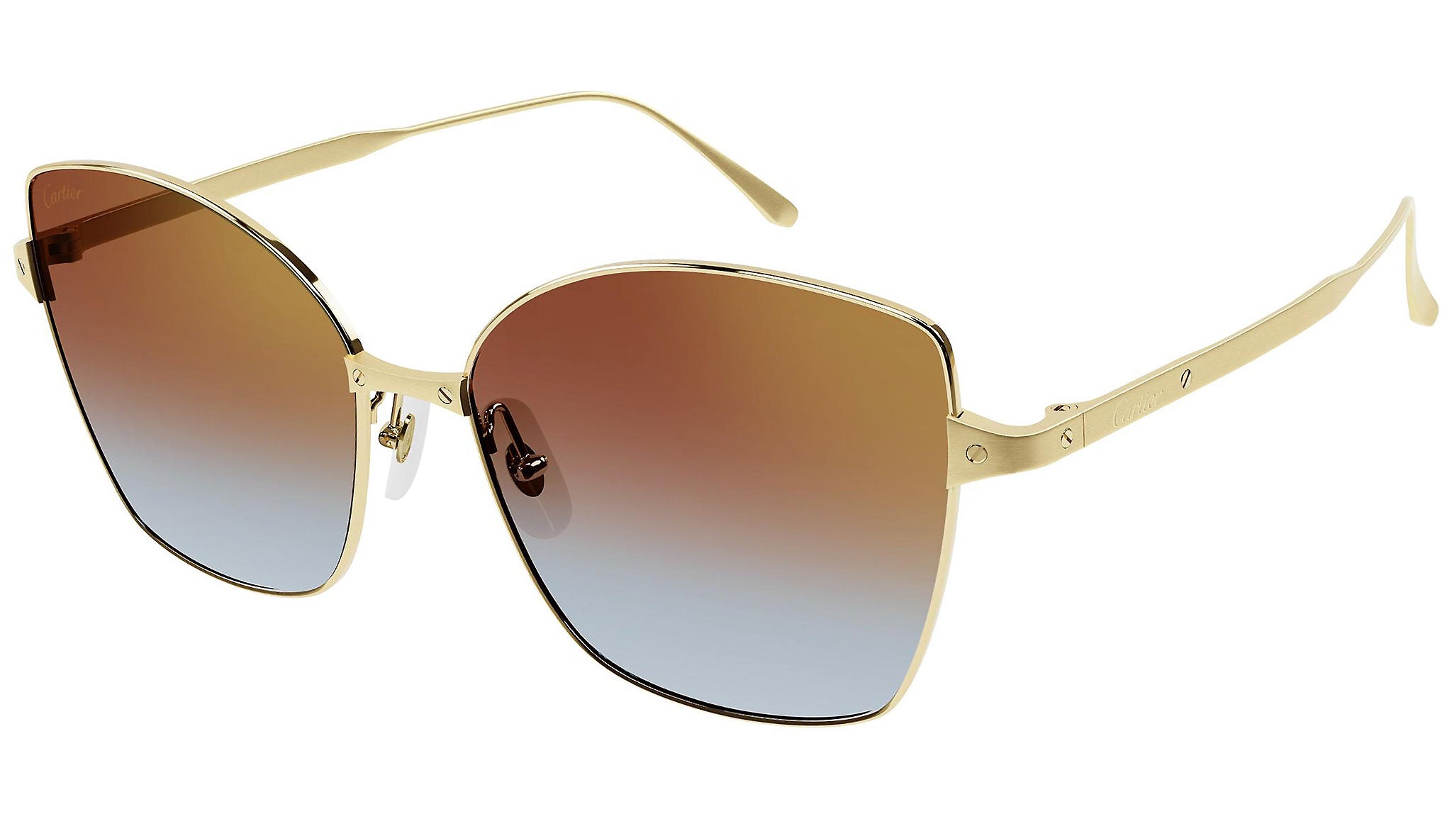 Occhiali da sole Cartier Core Range modello 0328S, variante colore 004 oro levigato satinato con lenti color marrone sfumato azzurro con flash oro. Fondata nel 1847, Maison Cartier non è solo uno dei nomi più affermati nel mondo della gioielleria e dell'orologeria, ma anche il punto di riferimento del più moderno concetto di lusso contemporaneo. Cartier crea occhiali eccezionali, declina ogni design traendo ispirazione dai tratti distintivi del proprio vocabolario iconico, guidato da una vision stilistica chiara, dalla creatività più distintiva, e da un savoir-faire eccezionale.