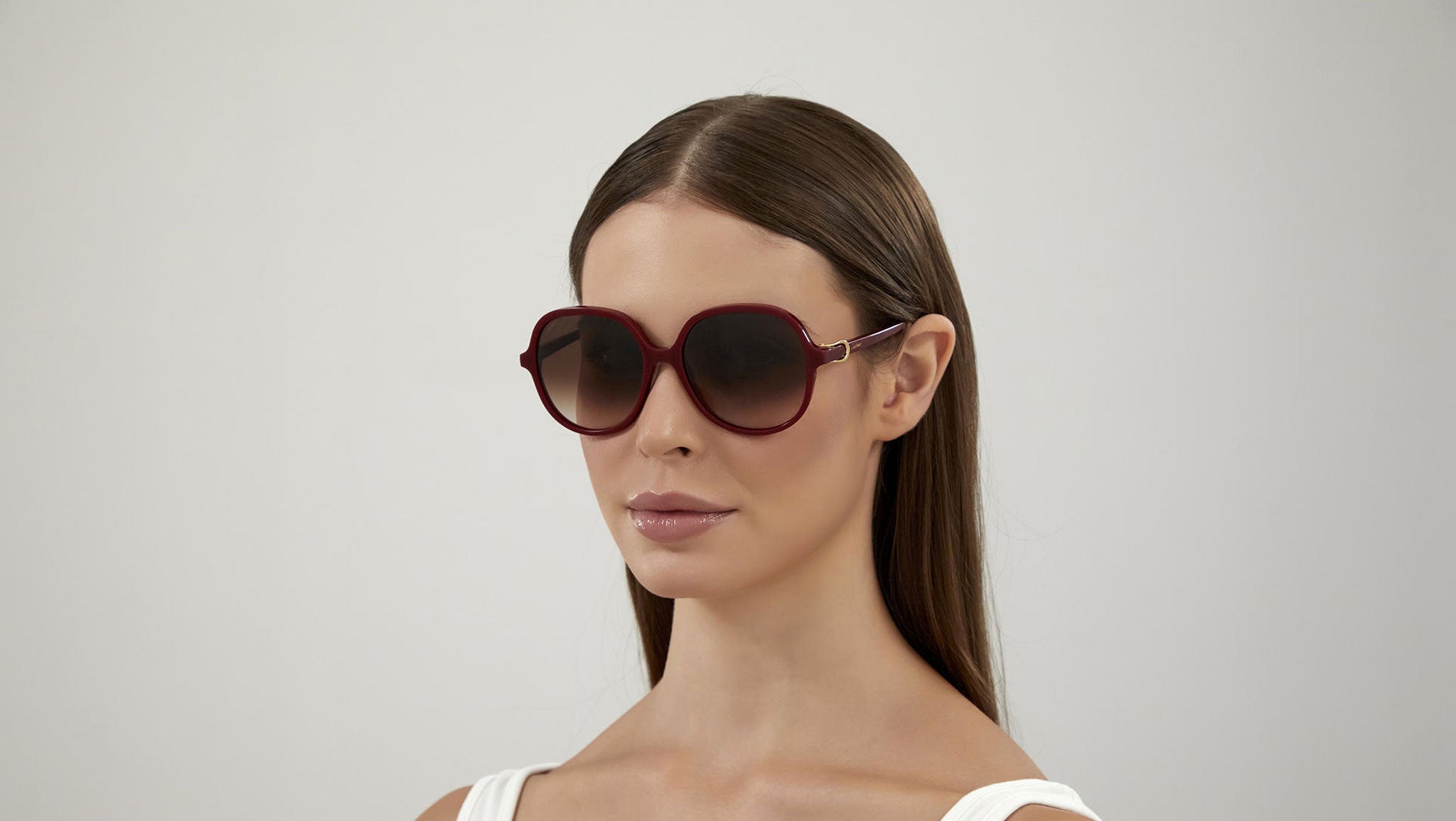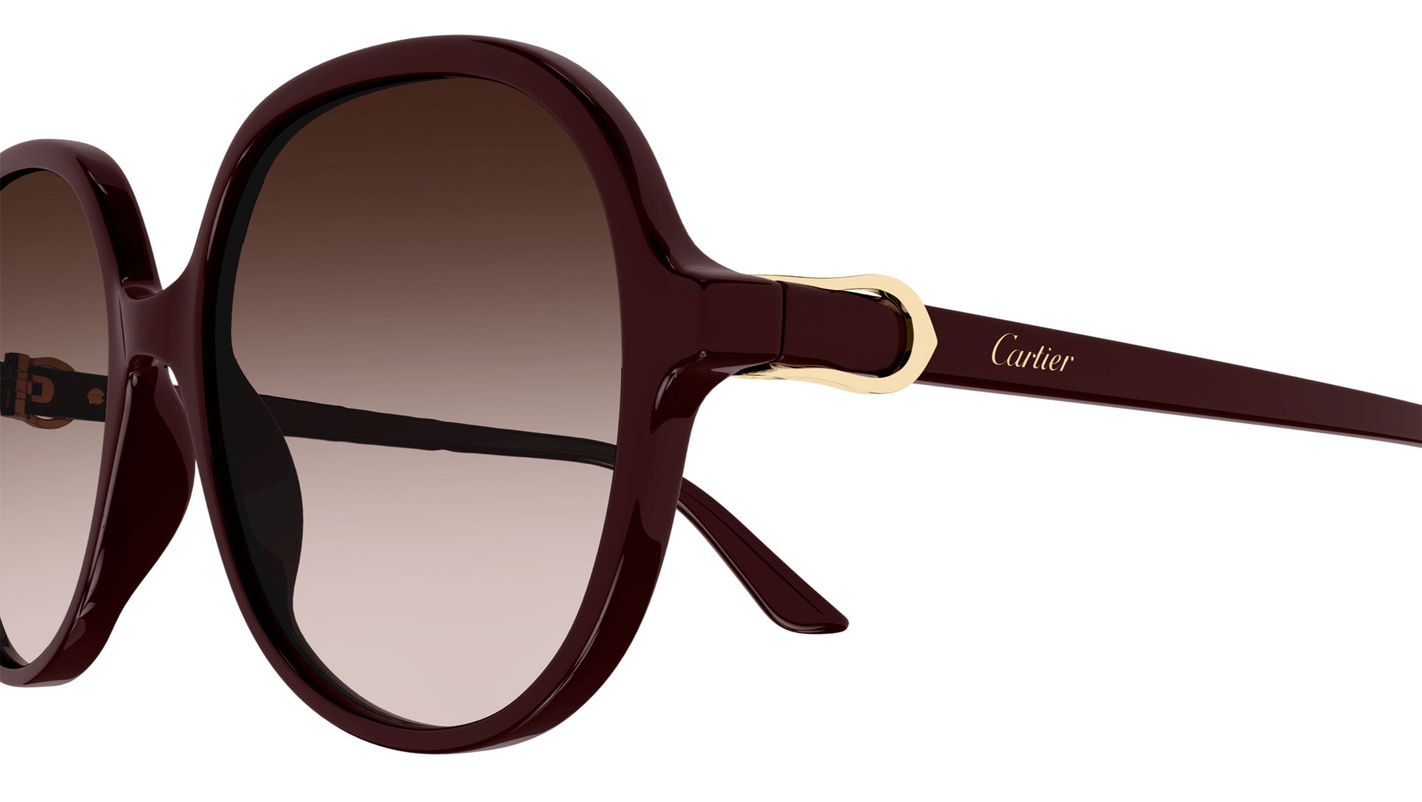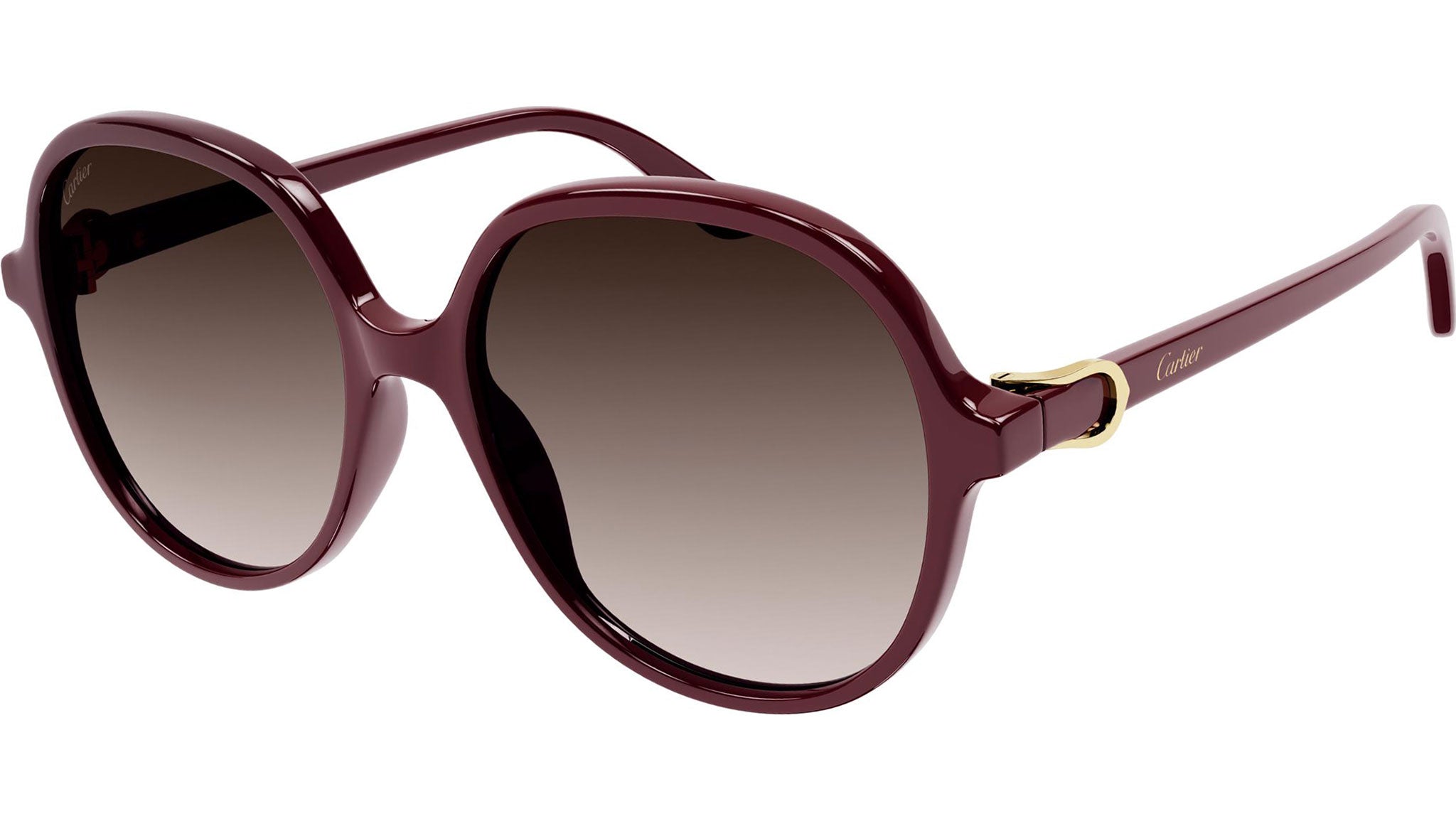 Occhiali da sole Cartier linea Initiation CT0350S 003 con montatura bordeaux e lenti color marrone sfumato.