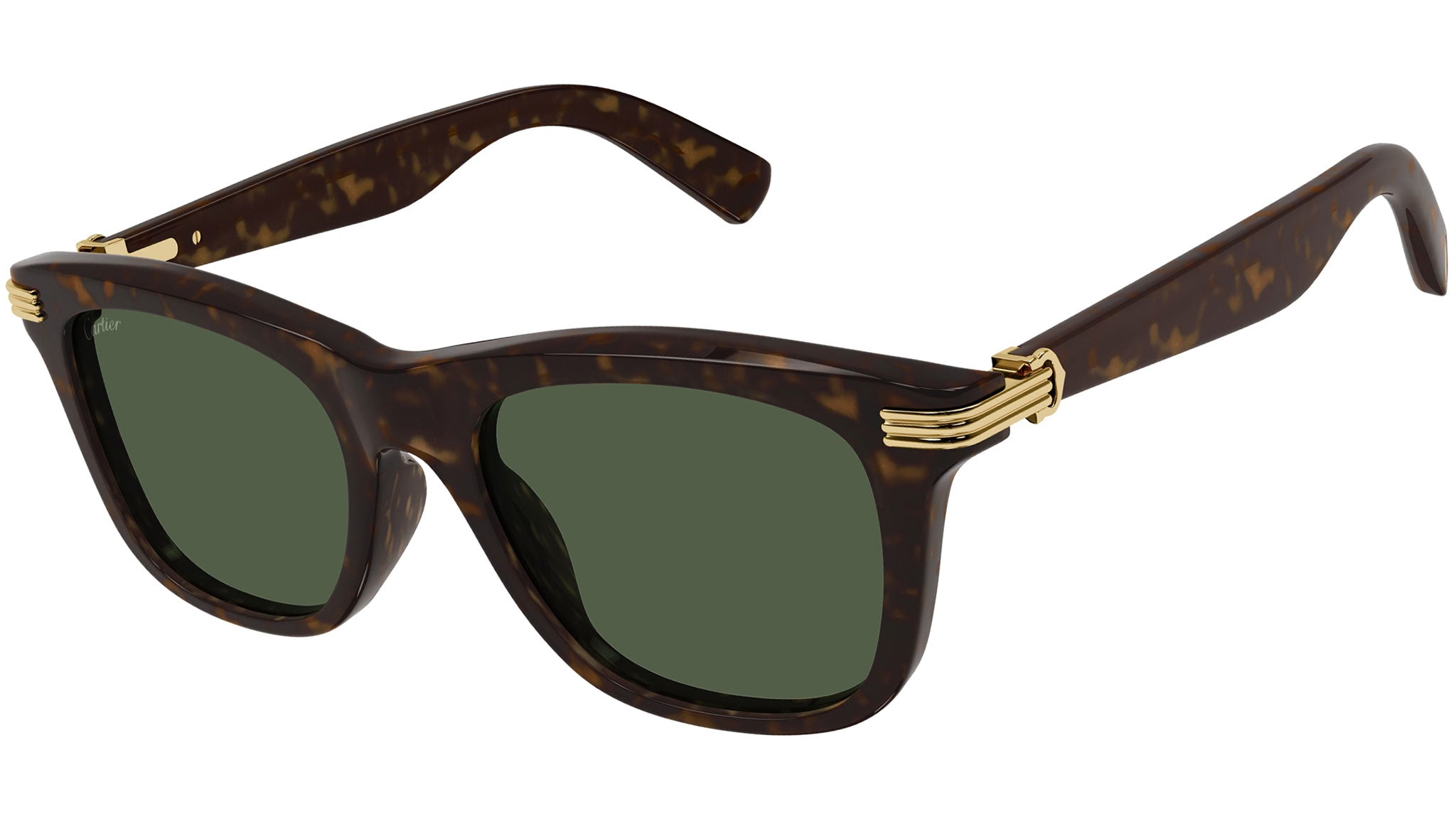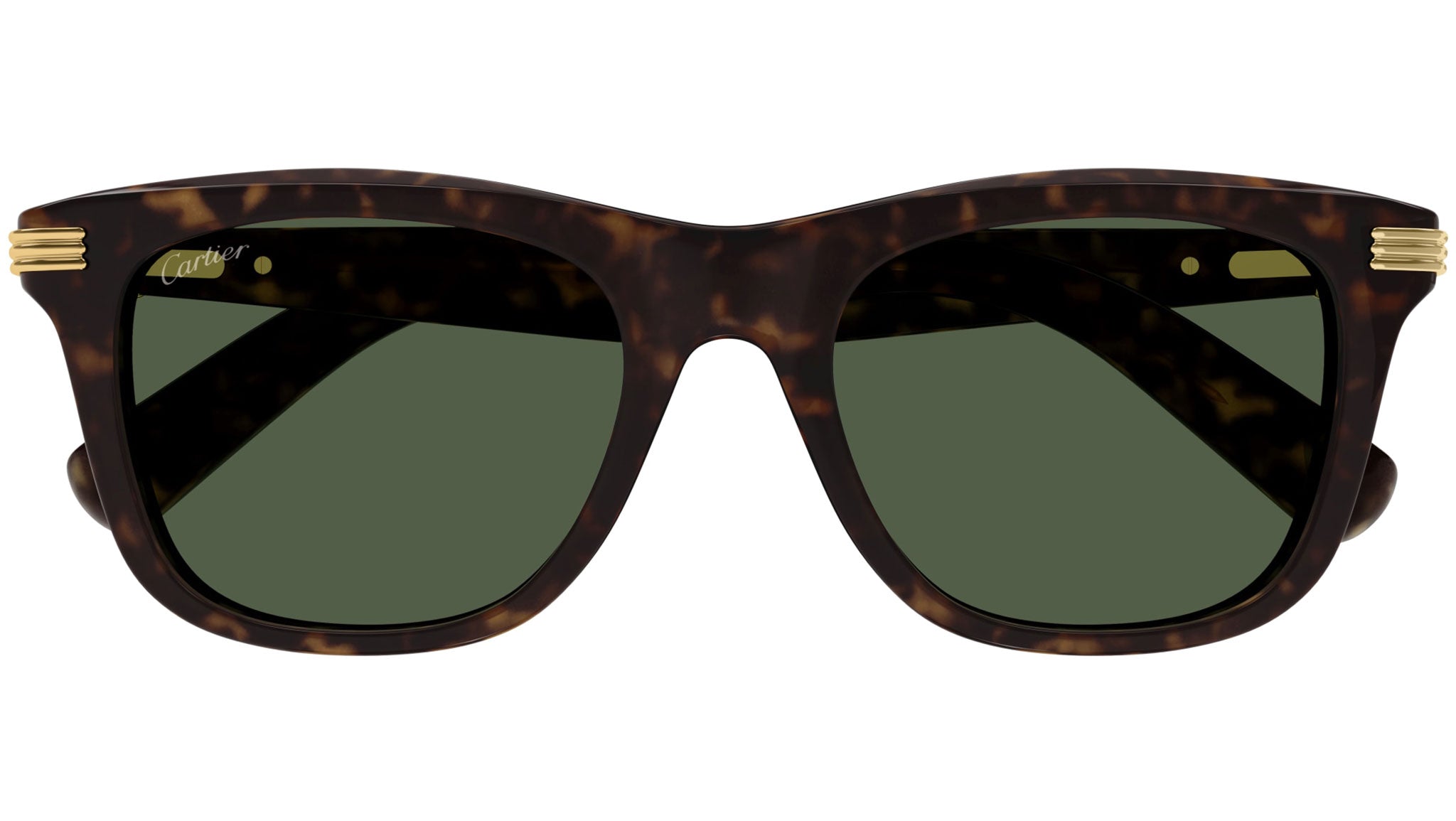 Occhiali da sole Cartier linea Contemporary CT0396S 002 con montatura tartaruga scuro e lenti color verde.