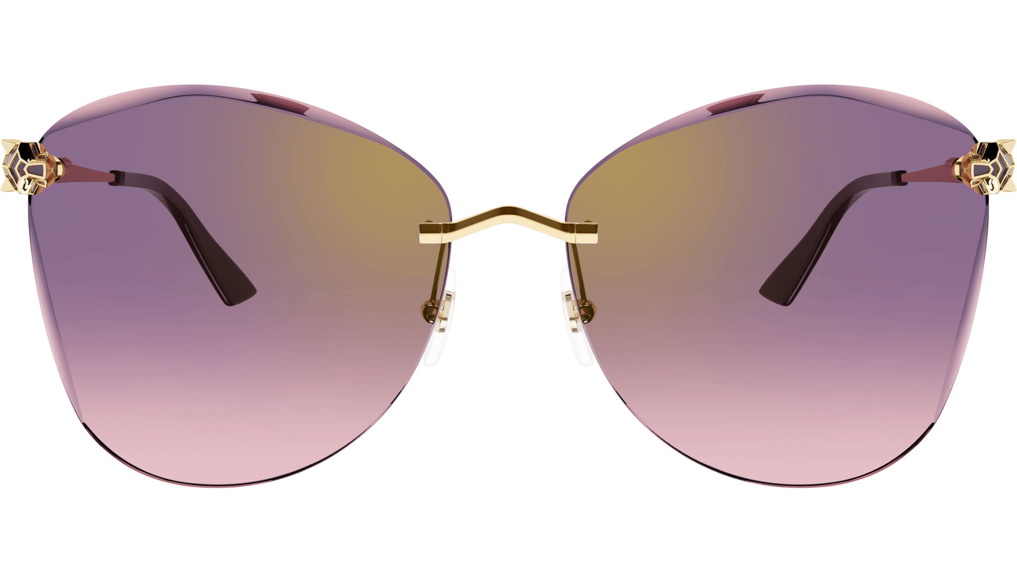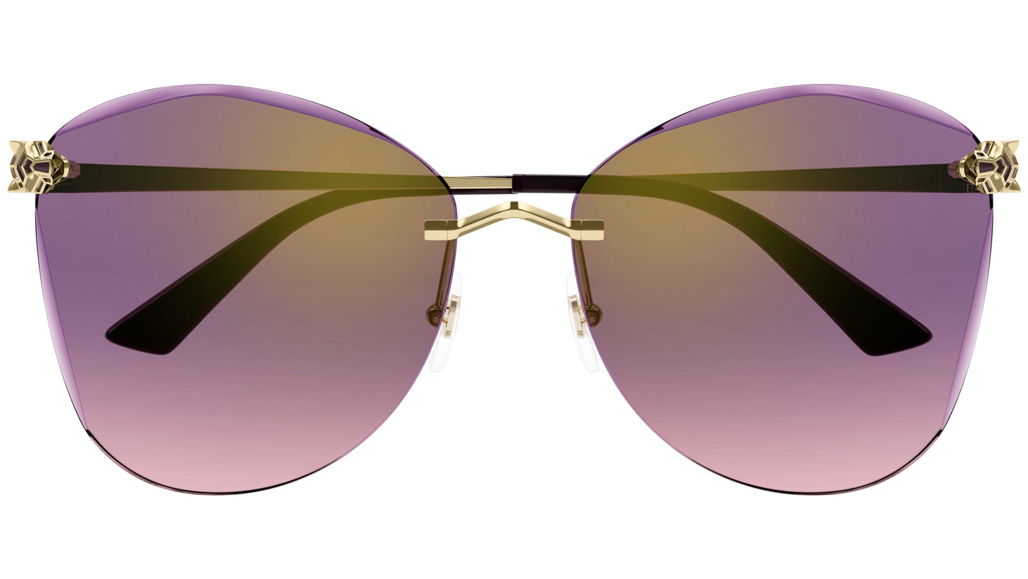 Occhiali da sole Cartier linea Core Range CT0398S 003 con montatura oro finitura smooth e lenti color prugna e rosa con flash oro.