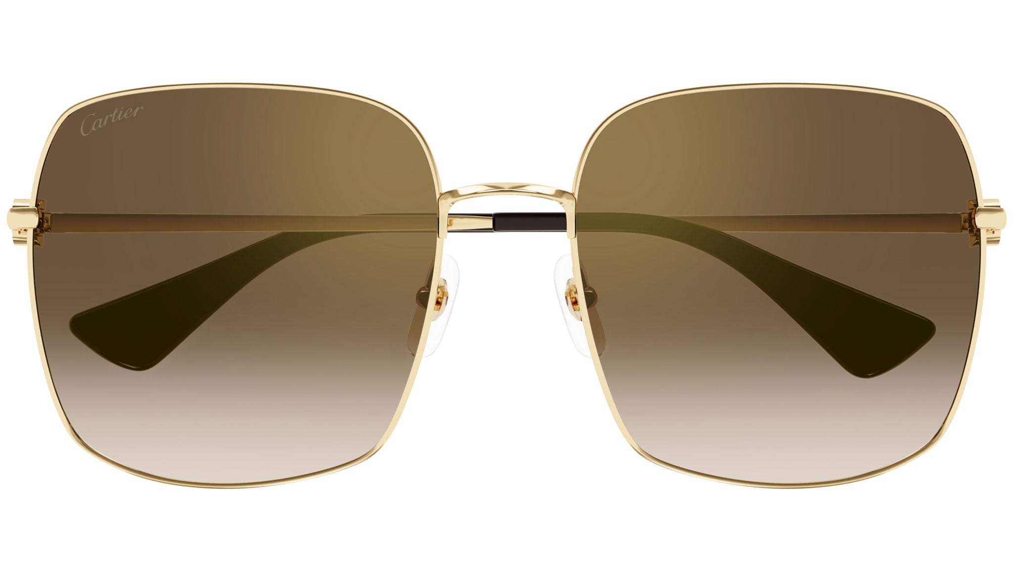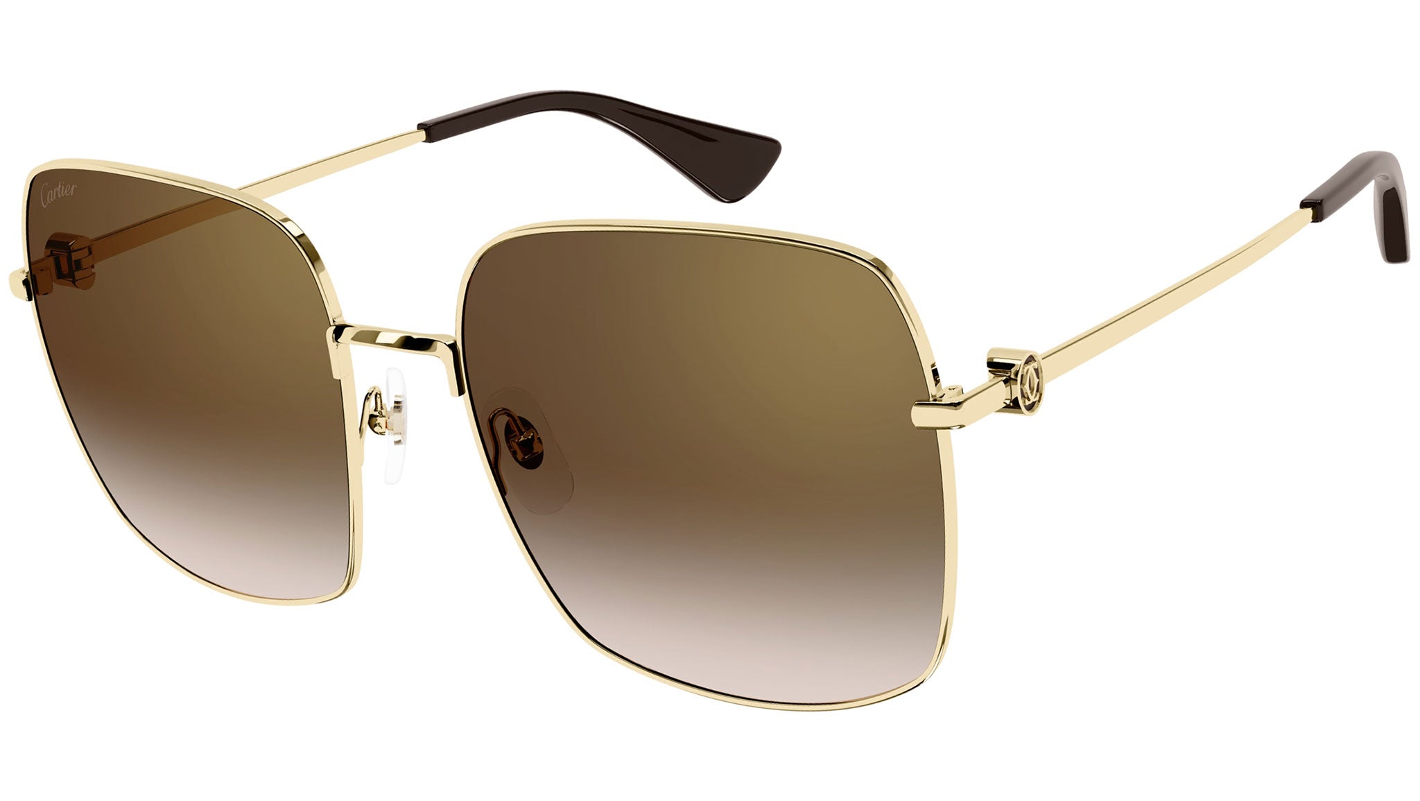 Occhiali da sole Cartier linea Core Range CT0401S 002 con montatura oro finitura smooth e lenti color marrone sfumato con flash oro.