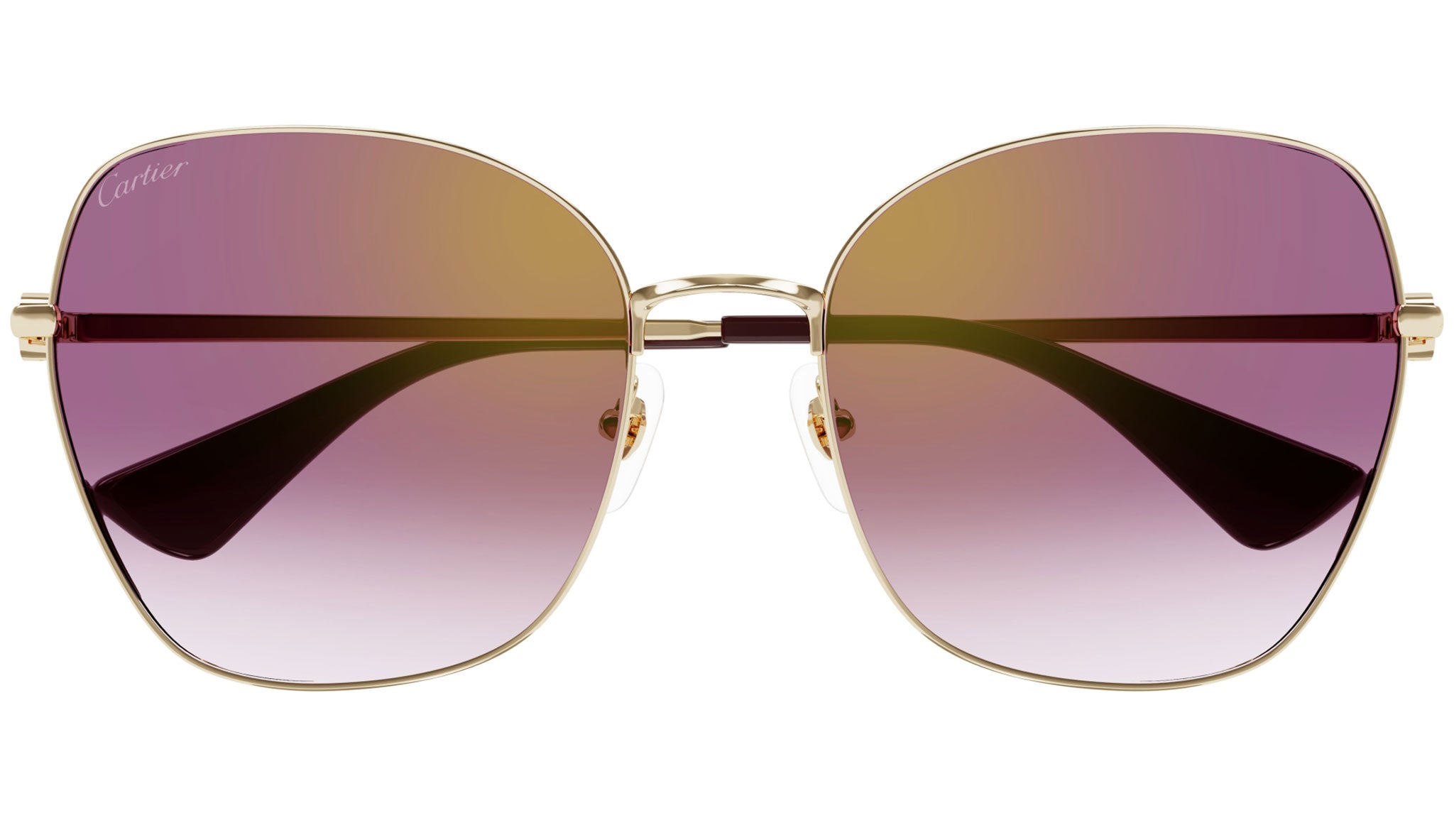 Occhiali da sole Cartier linea Core Range CT0402S 003 con montatura oro finitura smooth e lenti color ciclamino sfumato con flash oro.