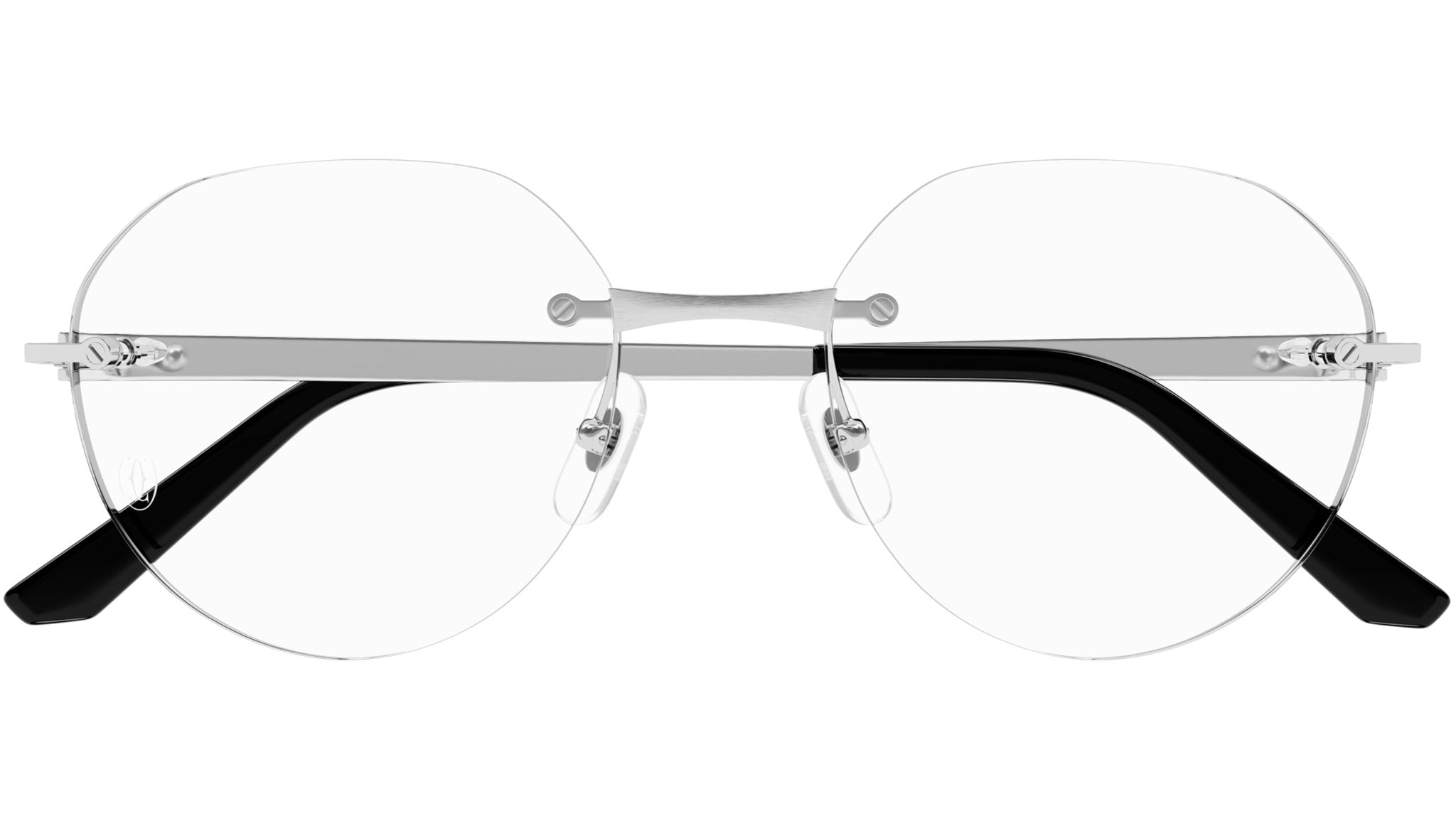 Occhiali da vista Cartier linea Exception modello CT0408O variante colore 002 finish platino levigato con astine color argento.
