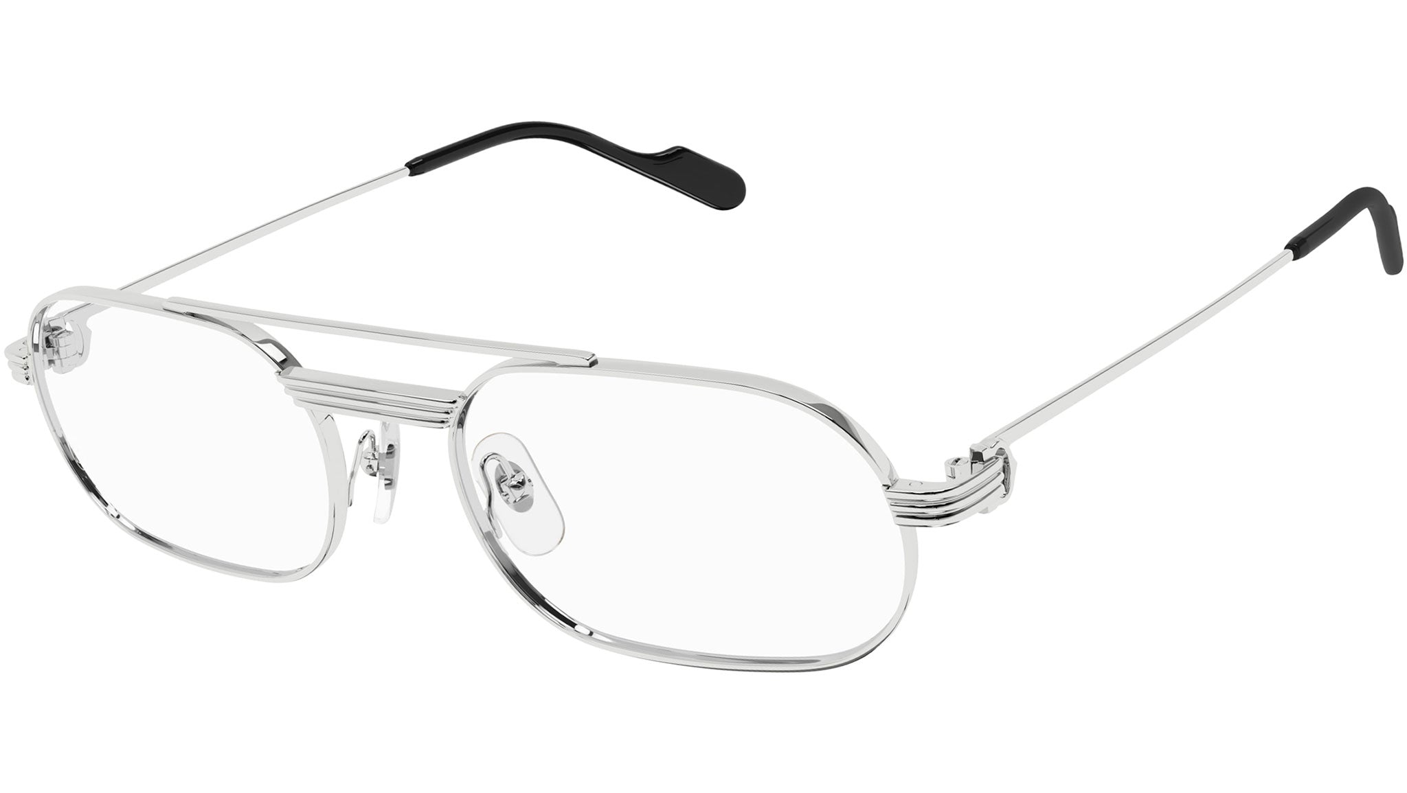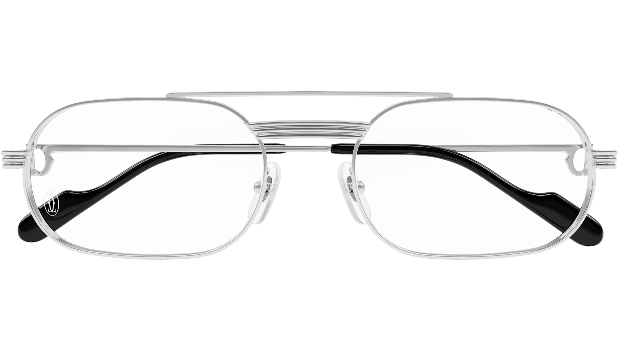Occhiali da vista Cartier linea Exception modello CT0410O variante colore 002 finish platino levigato con astine color argento.