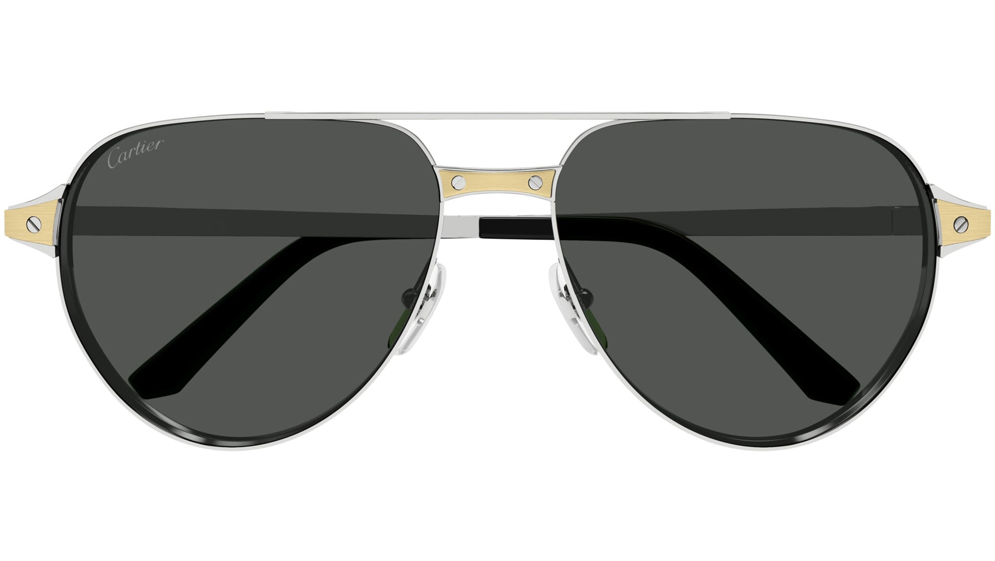 Occhiali da sole Cartier linea Exception modello CT0425S aviator in metallo codice colore 001 platino finitura levigata con inserti champagne con aste argento e lenti color nero polarizzato.