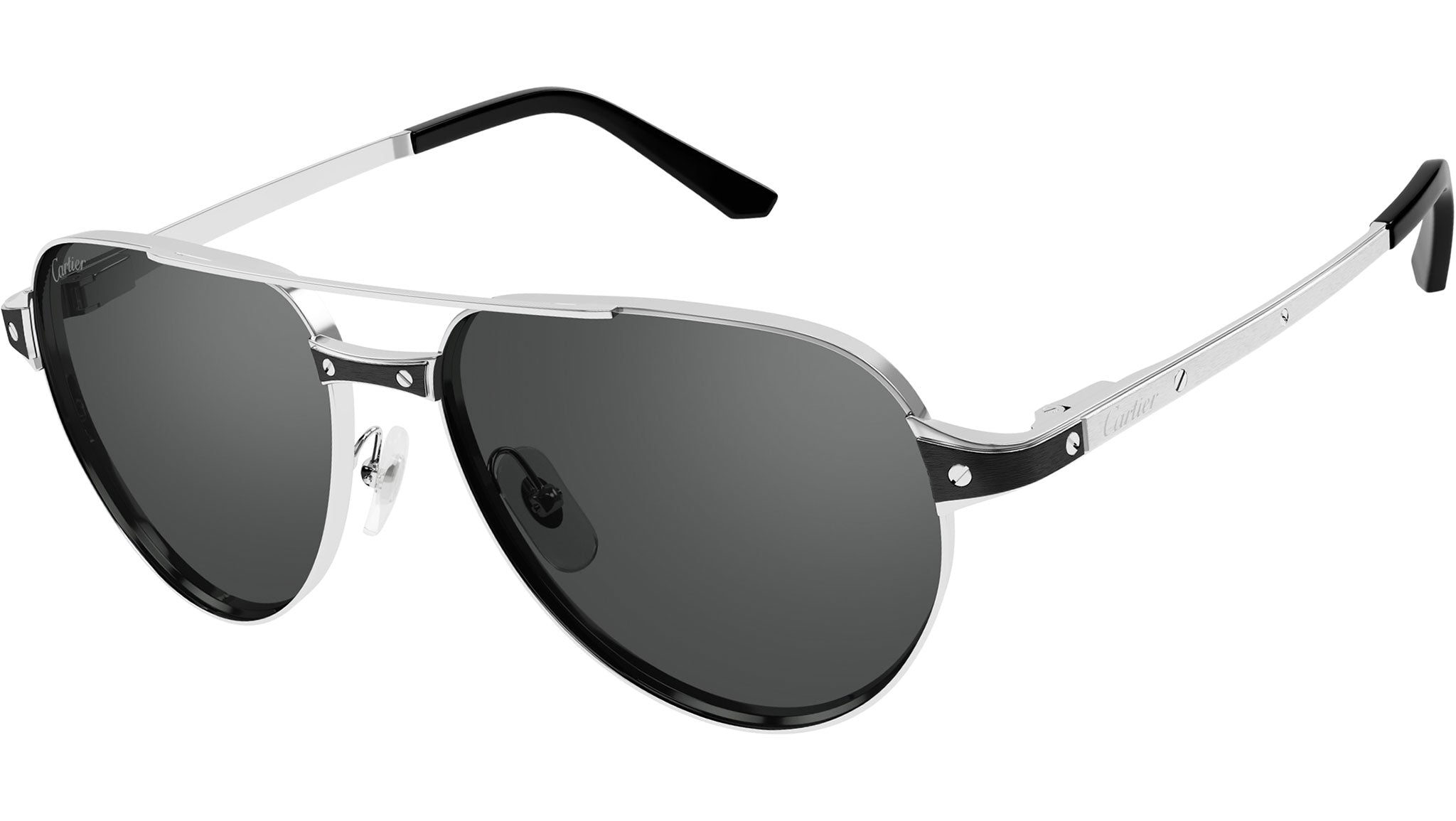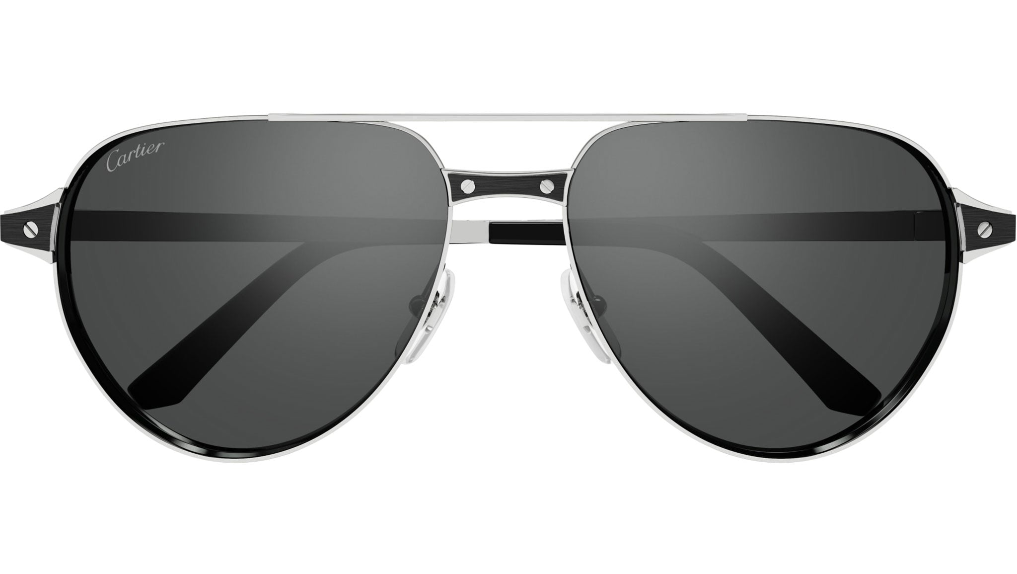 Occhiali da sole Cartier linea Exception modello CT0425S aviator in metallo codice colore 004 platino finitura levigata con inserti neri con aste argento e lenti color nero polarizzato.