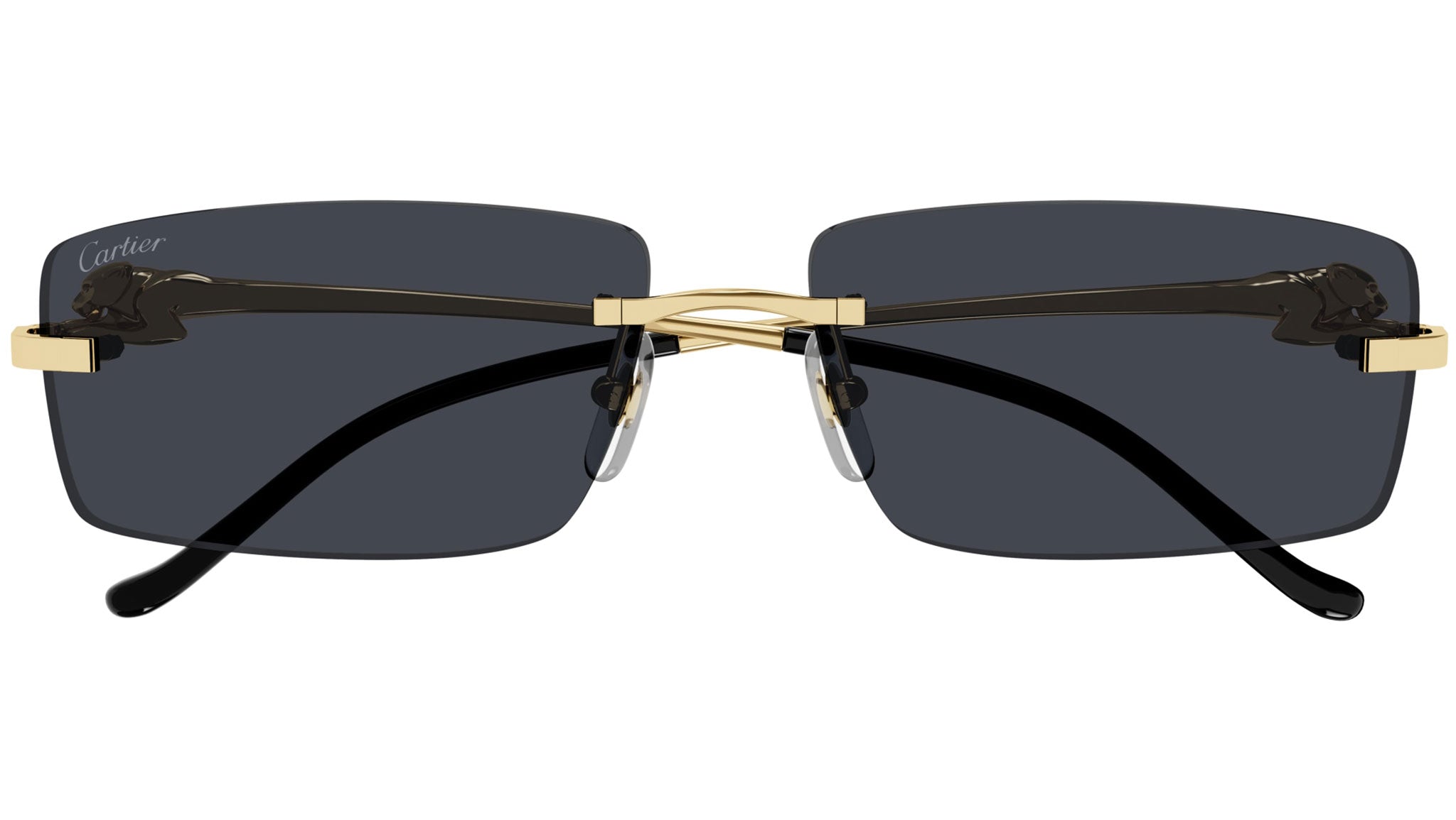Occhiali da sole Cartier linea Core Range modello CT0430S rectangle in metallo codice colore 001 oro finitura smooth con aste oro e lenti color grigio.