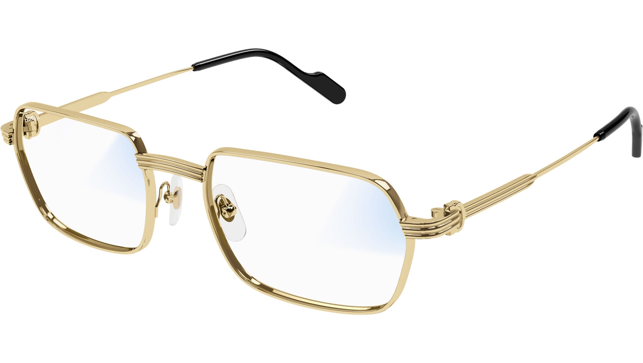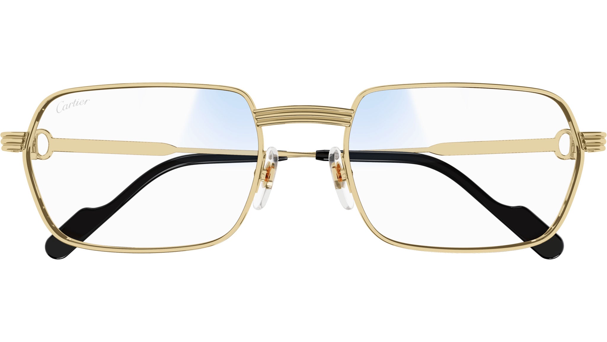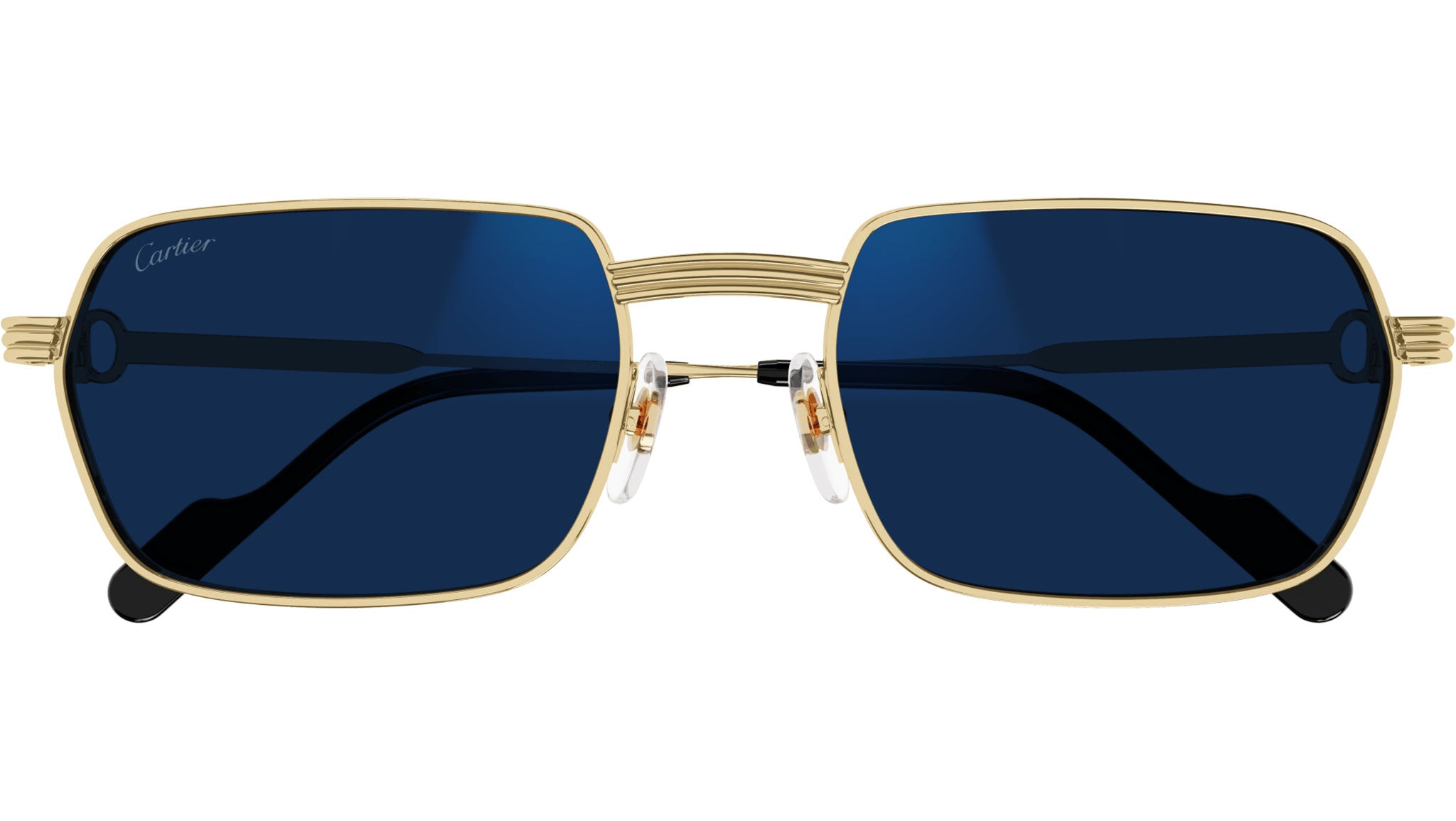 Occhiali da sole Cartier linea Core Range modello CT0463S rectangle in metallo codice colore 005 oro finitura smooth con aste oro e lenti color da trasparente a blu con antiriflesso e filtro luce blu.