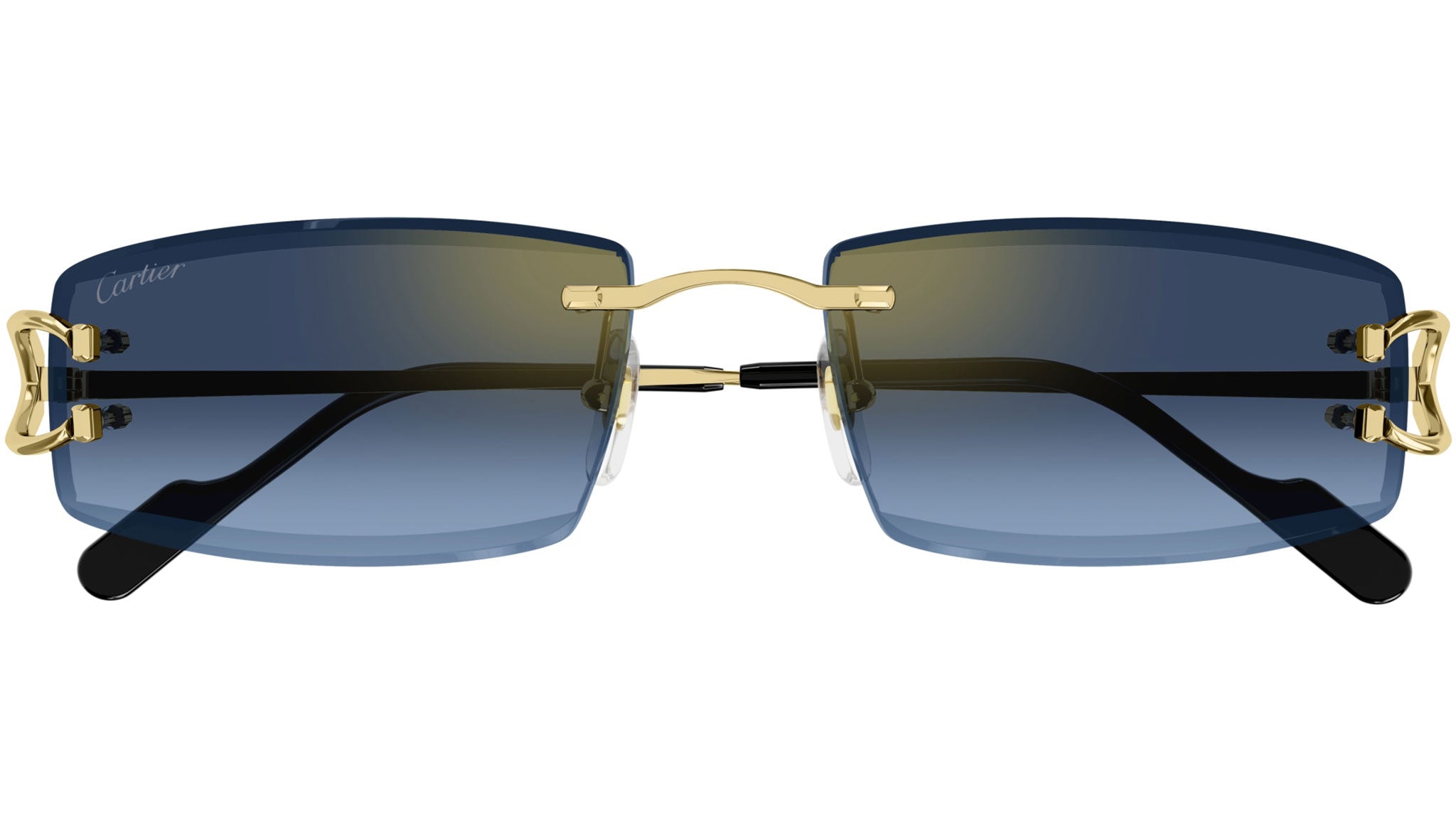 Occhiali da sole Cartier linea Core Range modello CT0465S rectangle in metallo codice colore 002 oro finitura smooth con aste oro e lenti color blu e azzurro con flash oro.
