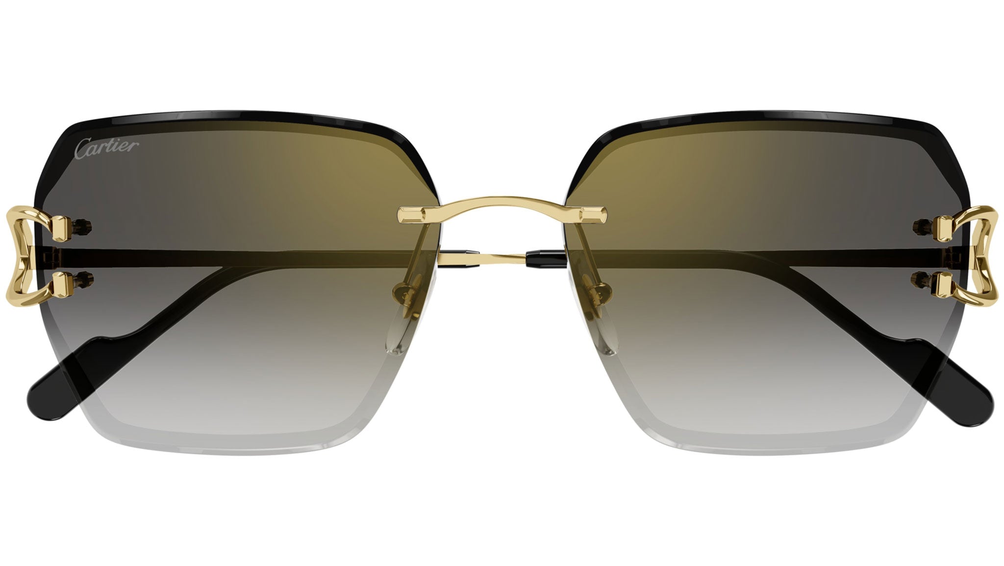 Occhiali da sole Cartier linea Core Range modello CT0466S cat eye in metallo codice colore 001 oro finitura smooth con aste oro e lenti color grigio sfumato con flash dorato.
