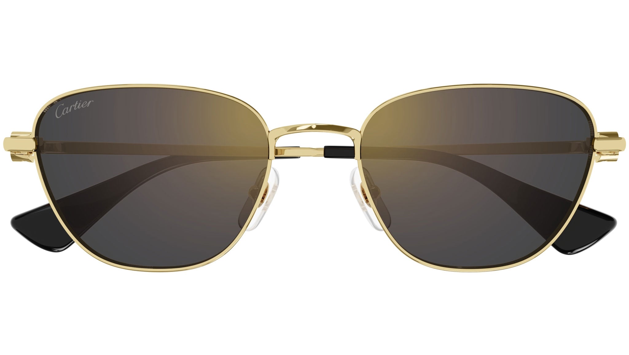 Occhiali da sole Cartier linea Core Range modello CT0469S cat eye in metallo codice colore 001 oro finitura smooth con aste oro e lenti color grigio con flash oro.